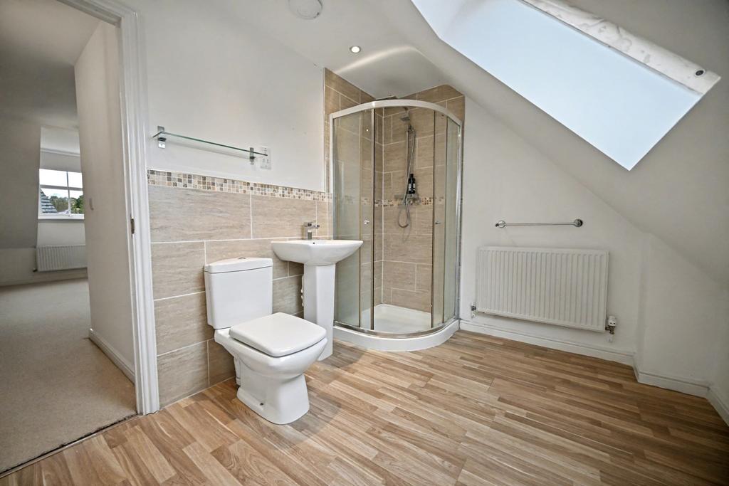 Fitted with a white suite comprising corner shower enclosure with chrome overhead shower & separate handheld spray, low level WC, pedestal wash hand basin, radiator, storage into eaves, laminate flooring and double glazed skylight to rear.