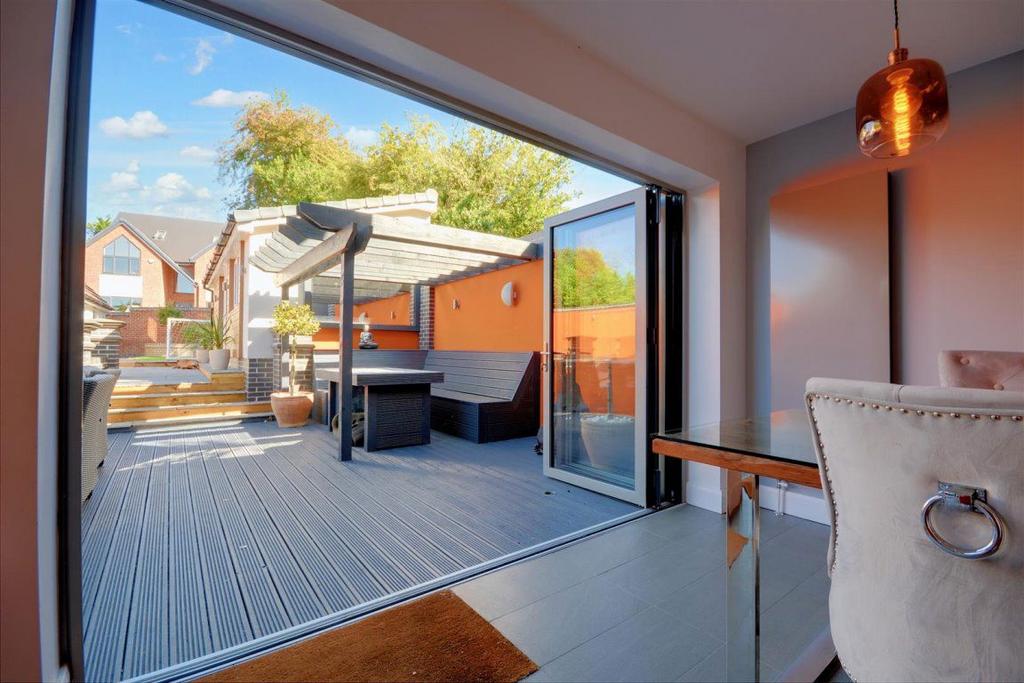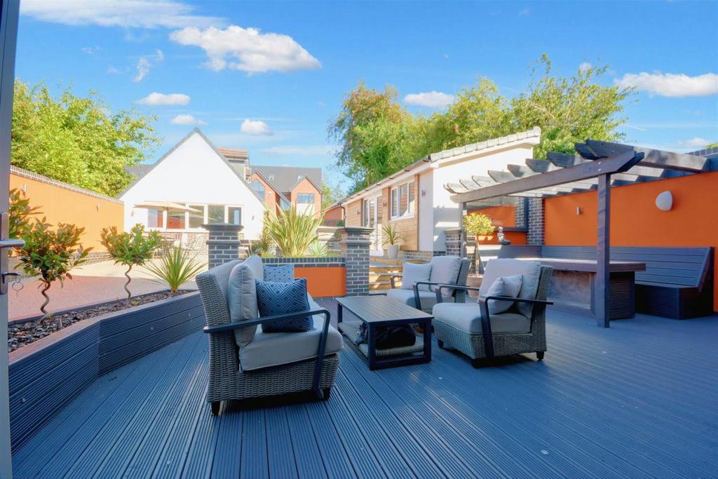 The rear gardens offer a contemporary social and relaxing space with a large decked terraced area framed with raised planters and a pergola with seating.