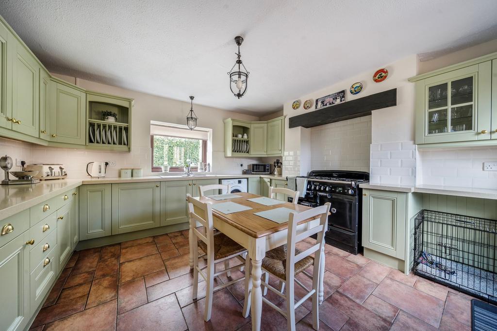 To the right of the hallway, the kitchen/breakfast room features a quality fitted kitchen with a traditional cottage feel, including a large range cooker, space for a fridge-freezer and other appliances, and ample room for a dining table. A door leads directly out to the garden's decking area, ideal for al fresco dining or soaking in the peaceful surroundings.