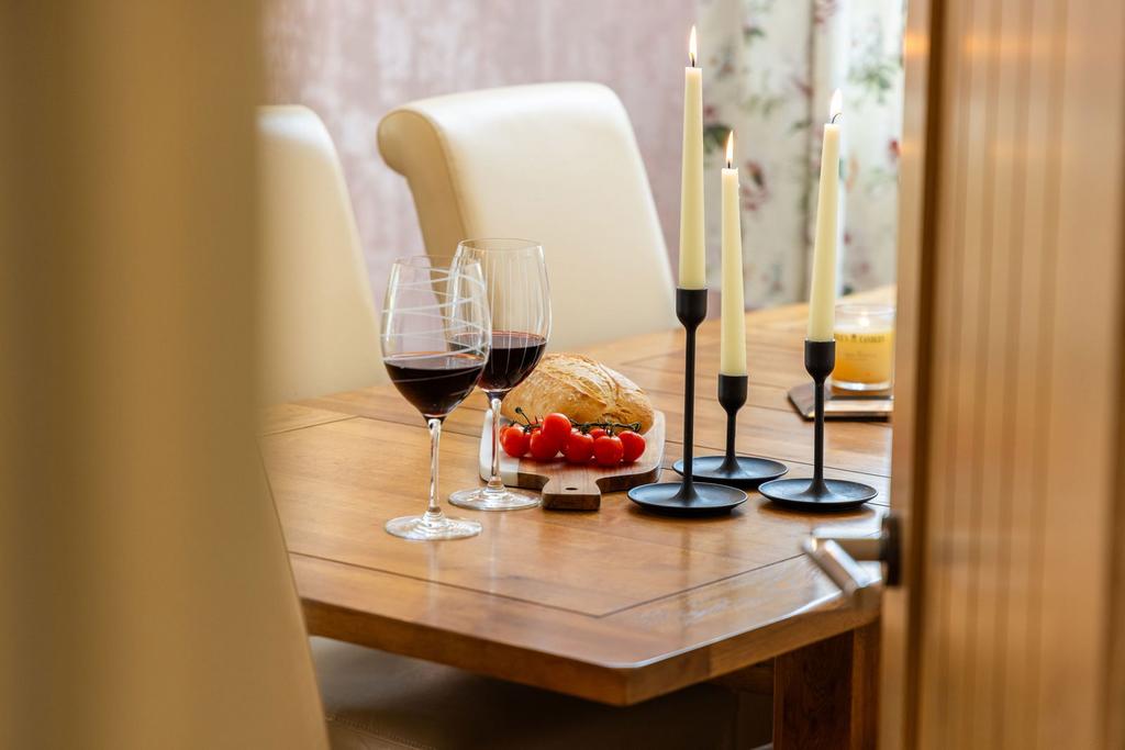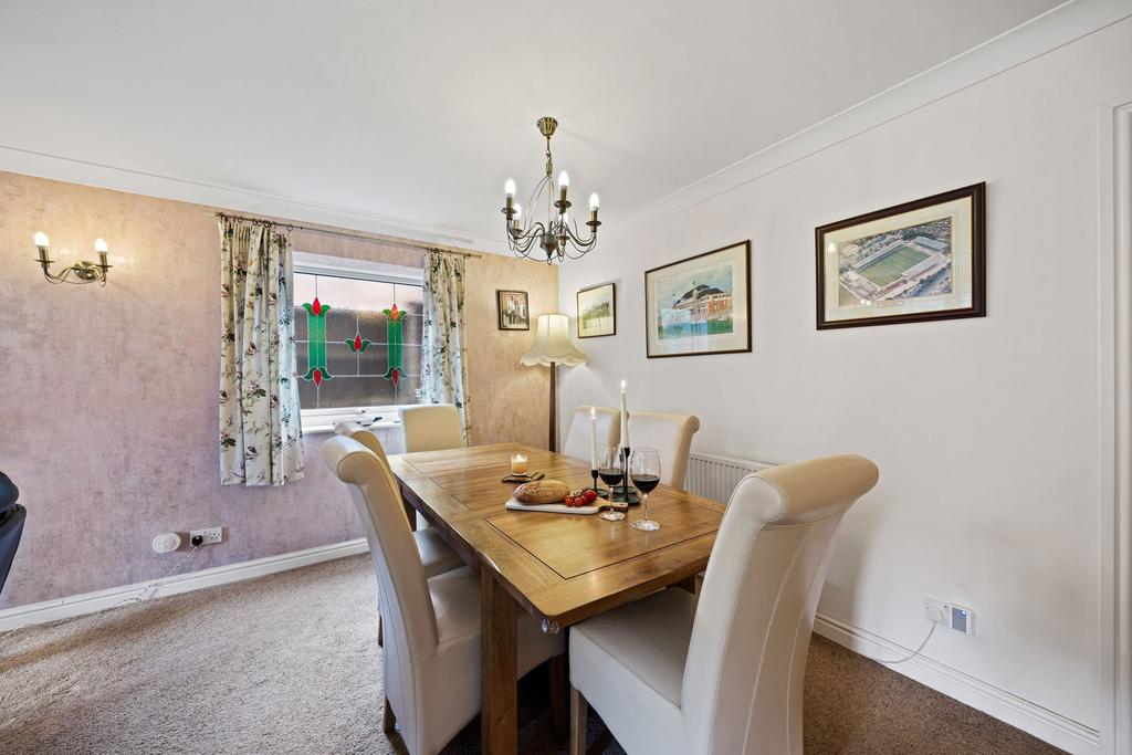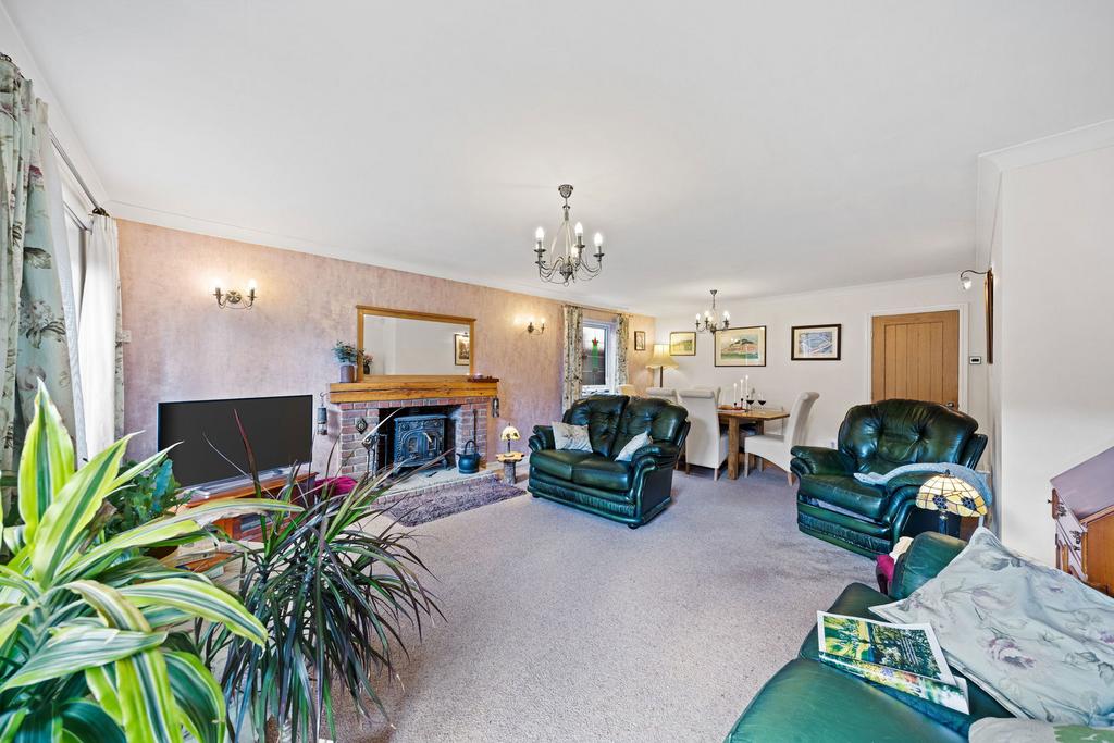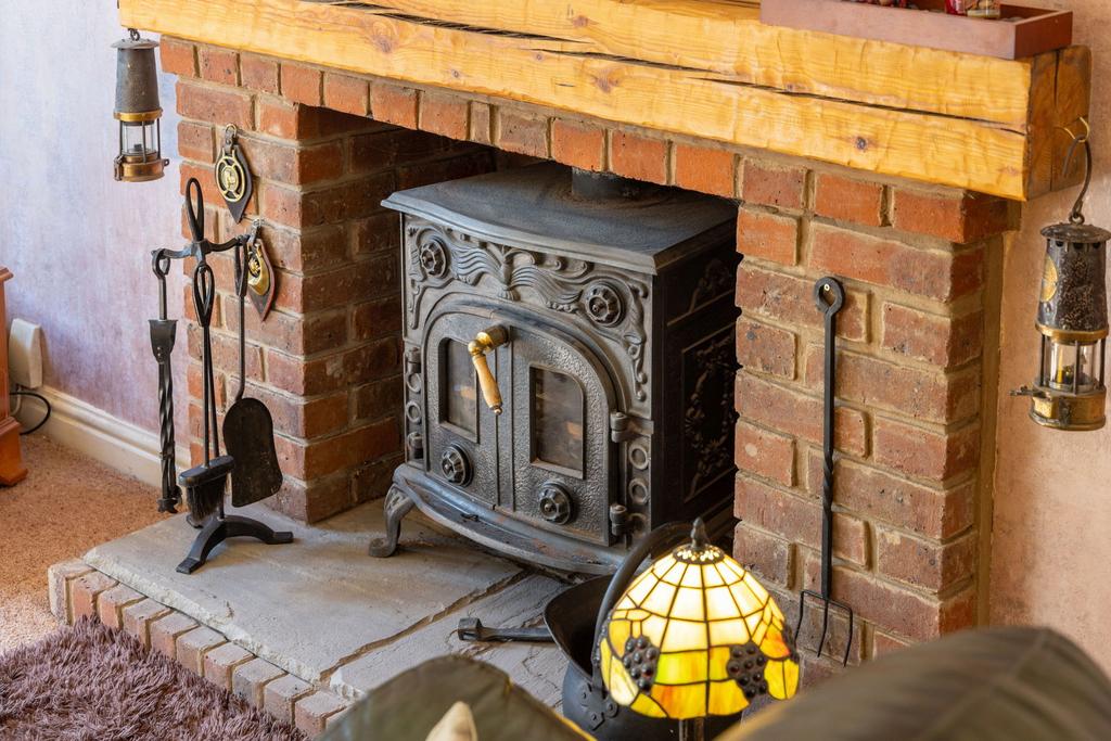 At the rear, the living room is a standout space. Twin patio doors open to the garden, while a traditional stained-glass window in the corner brings timeless charm to the dining area. A fireplace with a log burner and gorgeous wooden mantel takes centre stage, perfect for cosy autumn evenings