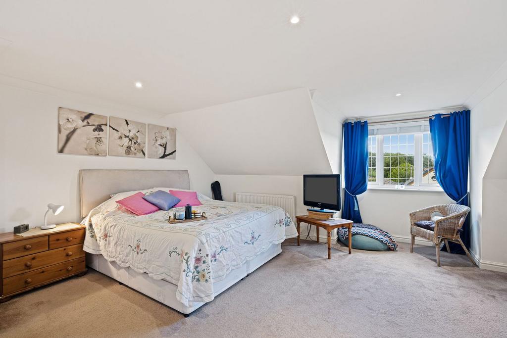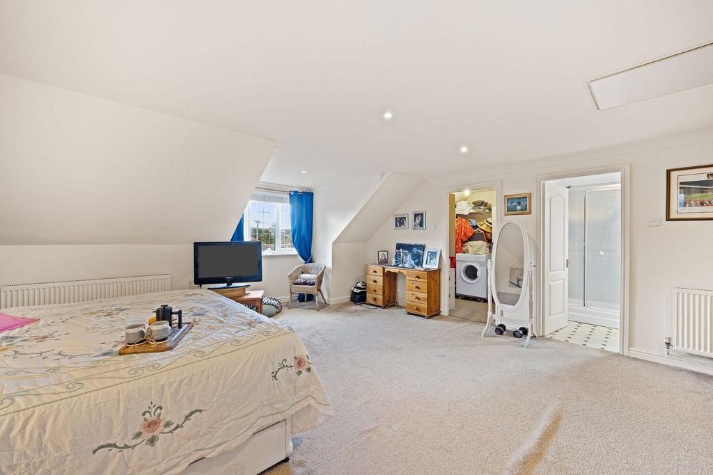 Upstairs, the main bedroom is a real treat. It’s full of character and natural light, with room for a king-sized bed, seating area, and even a tucked-away workspace beneath the window. Built-in storage keeps the space clutter-free, while the ensuite and walk-in cupboard add an extra layer of comfort and convenience.