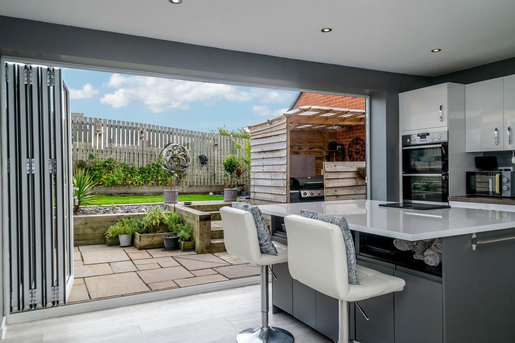 The spectacular open-plan kitchen/diner includes sliding bi-fold doors that lead out to the rear garden, perfect for sitting out during the summer months! There is ample space for a good sized dining table and chairs, offering somewhere for the family to gather at mealtimes. The white and grey, contemporary kitchen is well-fitted with a range of wall and base mounted units, complimentary work surfaces and all the mod cons needed for everyday living. Integrated appliances include a fridge/freezer, dishwasher, boiling water tap, double electric oven and a six-ring gas hob with extractor fan over. A matching breakfast island provides additional relaxed seating with built-in cupboards/drawers. The kitchen reveals a utility cupboard that houses the washing machine and tumble dryer, with ample storage.