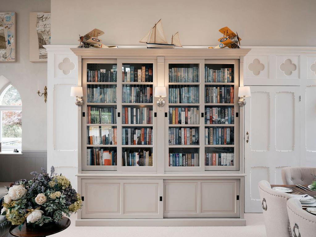 The former chapel hall now forms a breathtaking open-plan living space, cleverly zoned into a formal dining area and a cosy lounge. Double-height ceilings, original architectural features, and a minstrel gallery create an impressive sense of scale, while the feature wood burner beneath a striking window adds warmth and atmosphere. Despite its grandeur, the room feels inviting and homely—ideal for both everyday living and entertaining on a larger scale.