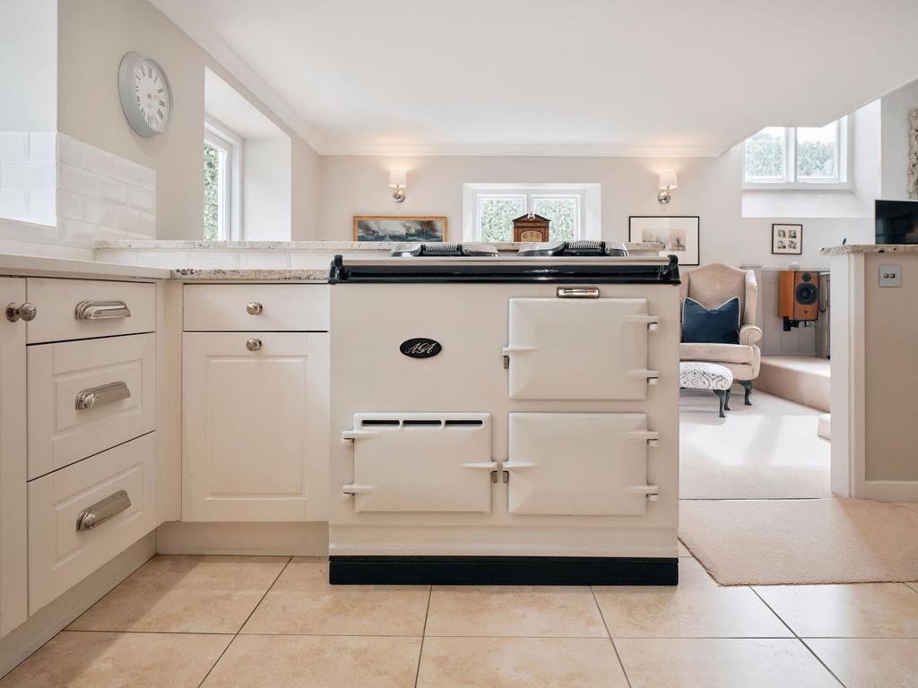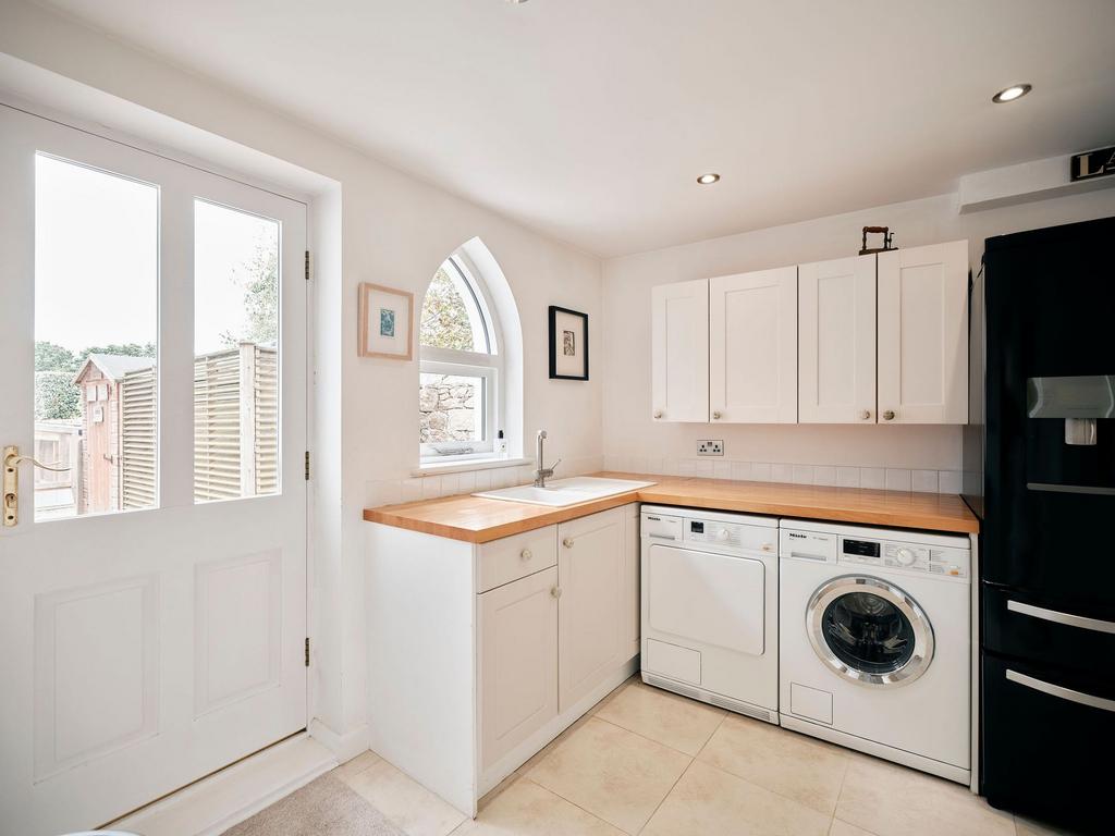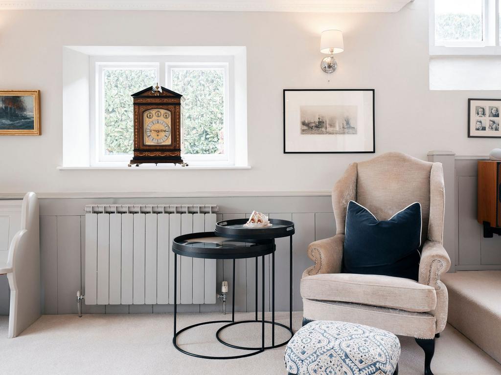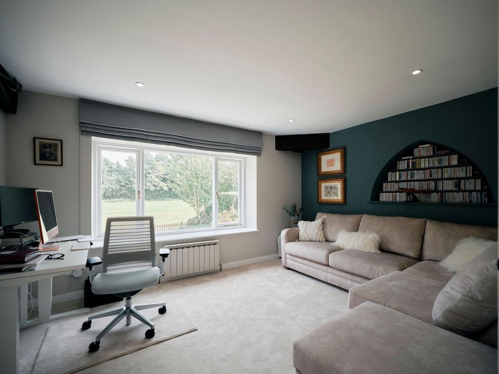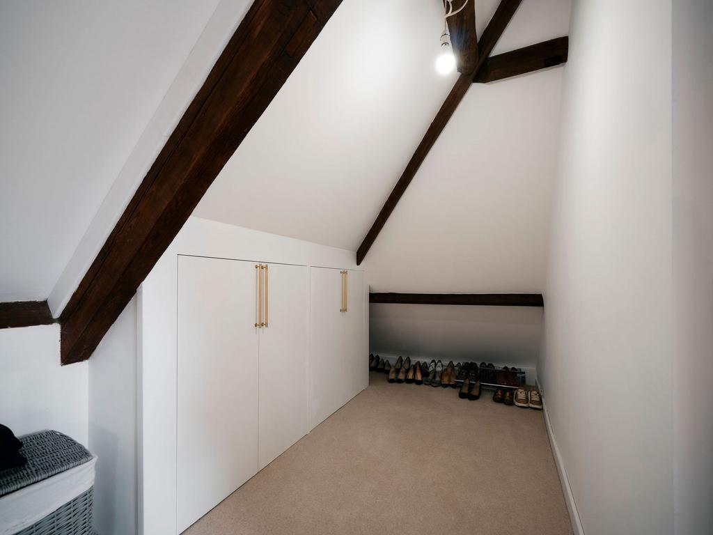 The first floor offers two generously sized double bedrooms, each with bespoke fitted wardrobes and views across open countryside through characterful chapel windows. These rooms share a stylish house bathroom with a fast-fill bath, perfect for unwinding. The top floor is dedicated to the principal suite, a truly special retreat featuring exposed beams, clever storage, and a spacious en-suite shower room. This private sanctuary feels both charming and practical, offering a peaceful escape from the rest of the home.