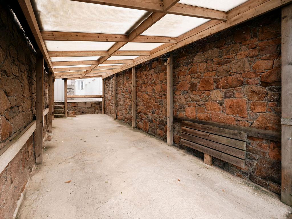 Car port offering tandem parking for two vehicles plus plenty of on-road parking.