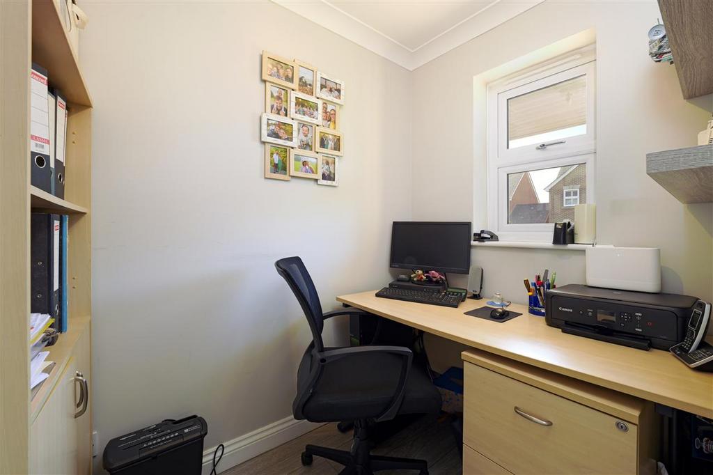 The entrance hall opens into a light-filled study to the right, ideal for home working, and to the left is a welcoming sitting room complete with an elegant gas fireplace and an attractive mantel. To the rear, a formal dining room with French doors opens directly onto the garden.
