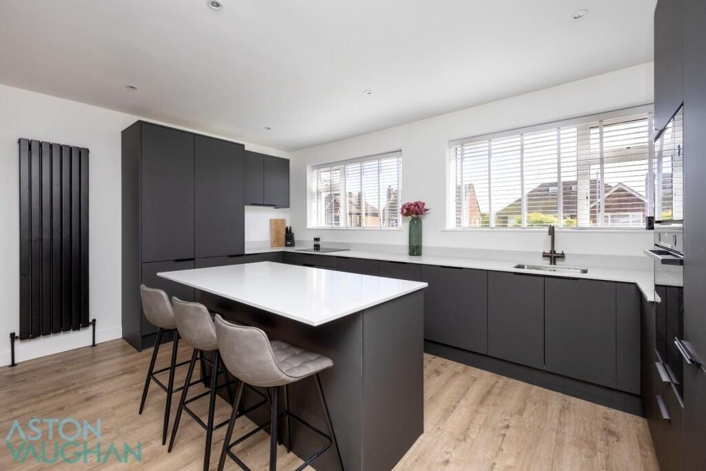 Spanning the depth of the house and completely open plan, the main reception room is vast with clearly defined areas for entertaining, formal dining, relaxation and family time. Streamlined and modern, the kitchen has handle-free cabinetry in matt charcoal grey paired with white quartz worktops which provide ample food preparation space in across the units and on the island which has breakfast bar seating for three. All appliances are integrated, to include a boiling water tap, so you can move in with relative ease, and the utilities are peacefully tucked away in a spacious adjoining utility room. Towards the rear of the room, there is space for a corner sofa and a formal dining table and chairs, which can spill outside to the rear garden via a wall of bi-folding doors for alfresco lunches and dinners in the summer sunshine.