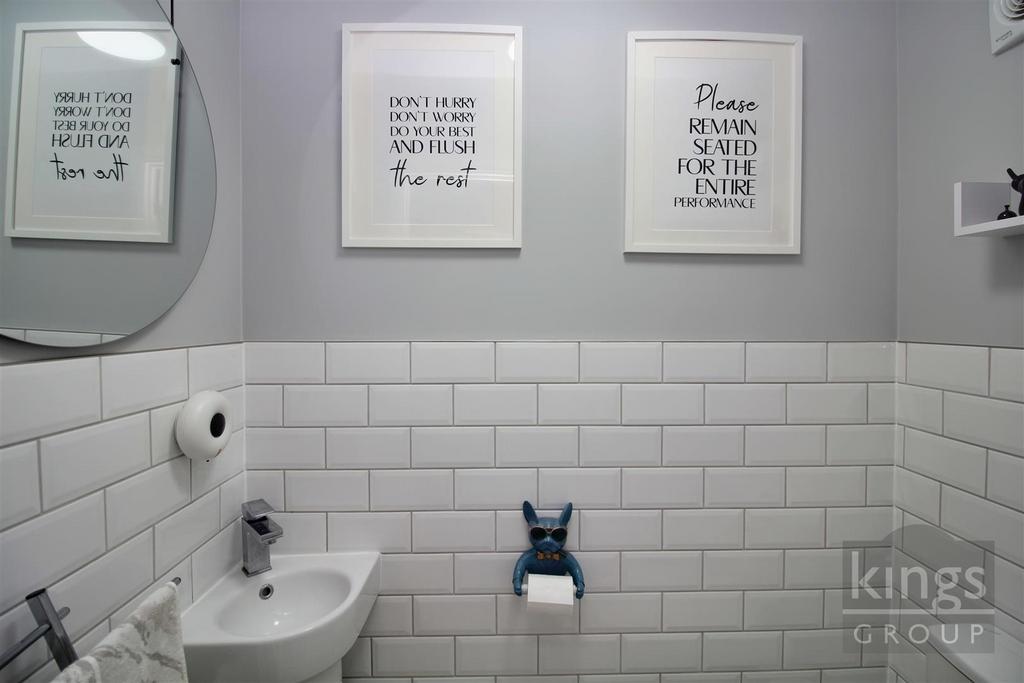 Cloakroom - Part tiled walls, wash basin with mixer tap, low level W.C, single radiator.