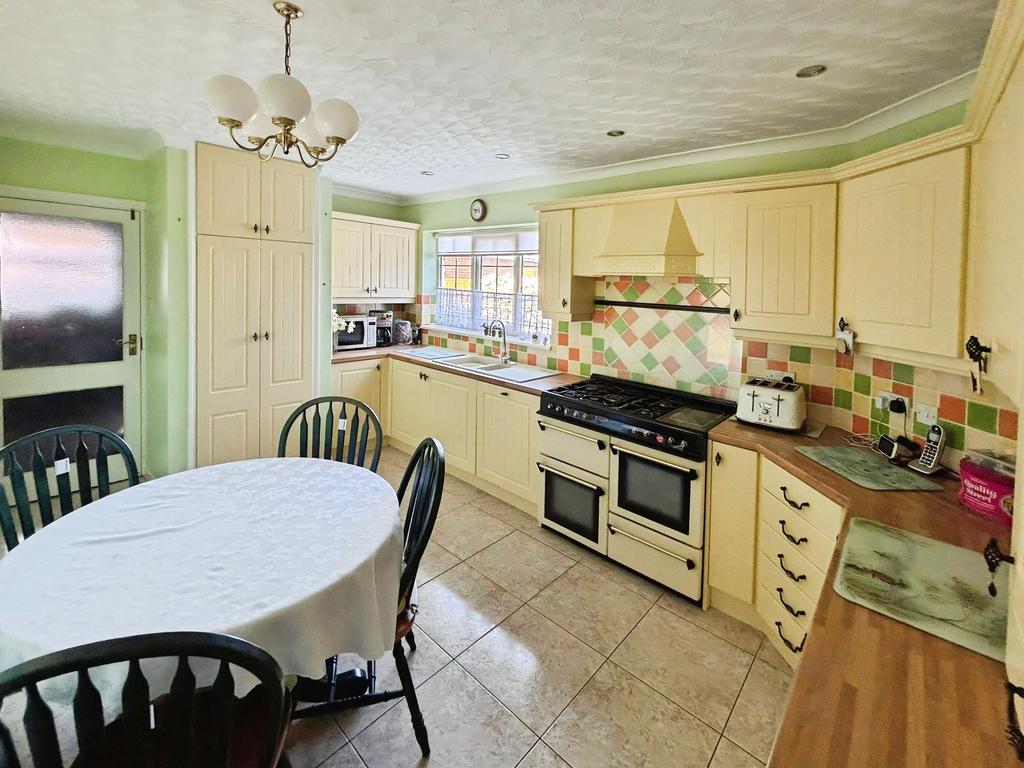 Fitted with a range of wall and base units, tiled splashbacks, stainless steel sink with mixer tap, range cooker with gas hob with extractor hood over, integrated dishwasher, tiled flooring, serving hatch to the dining room, pantry cupboard, single glazed door to the garage and window to the front aspect.