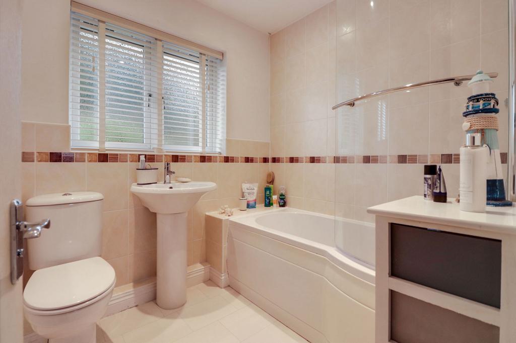 FAMILY BATHROOM SUITE: Fitted with bath, shower over and shower screen, wash hand basin and WC, heated towel rail, inset ceiling spotlighting, double glazed window with patterned glass.