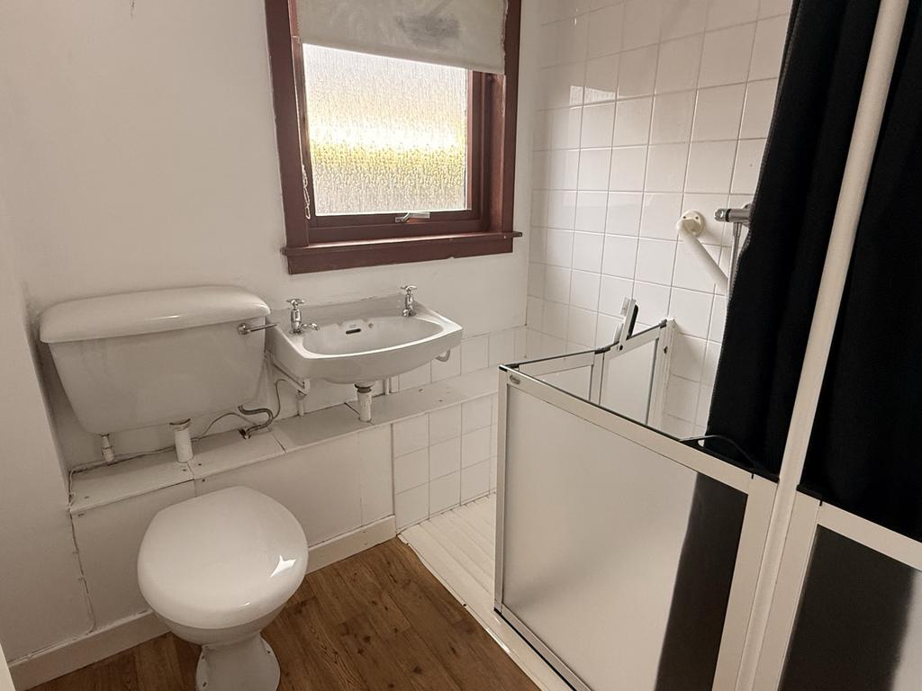 WC. Wash hand basin. Vinyl flooring. Window to rear of property. Radiator. Level access shower. Tiled walls around shower enclosure.