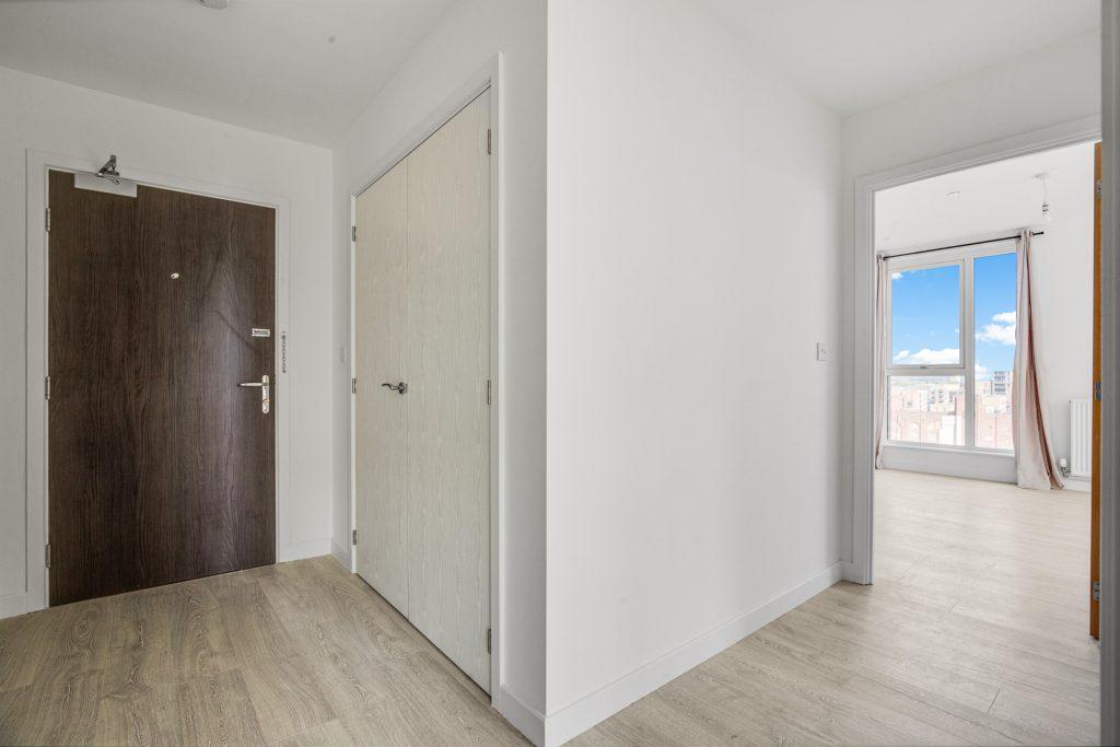 The heart of this flat is its open-plan kitchen and reception area, flooded with natural light from dual-aspect floor-to-ceiling windows. The sleek, modern kitchen is fully integrated, featuring white handleless cabinetry, ample worktop space, and under-cabinet lighting. The neutral décor and wood-effect flooring enhance the airy, contemporary feel of the space, which flows seamlessly into the generous living area - ideal for relaxing or entertaining.