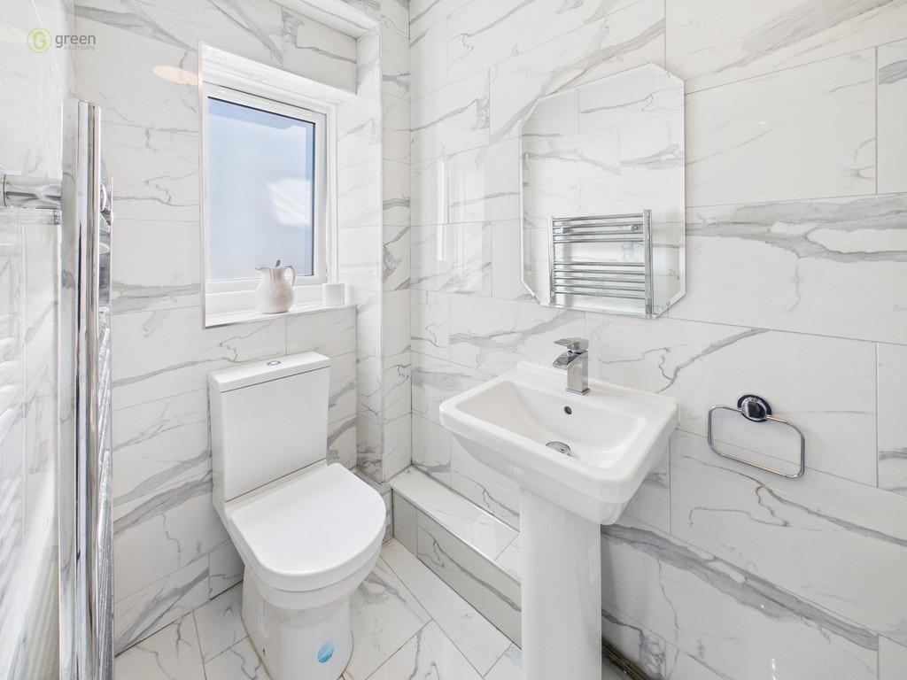 SEPARATE WC Having double glazed window to rear, tiled walls and flooring, heated towel rail, low level WC and pedestal wash hand basin.
