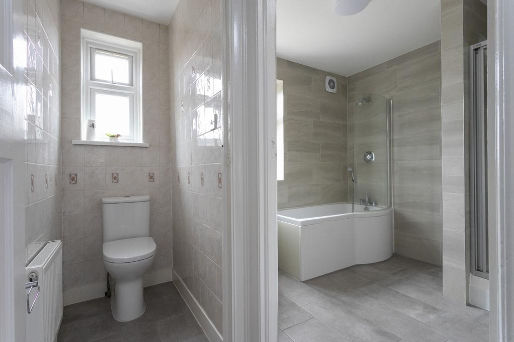 This first floor bathroom has both Shower area and Bath tub fitted and it is very good in size. Tiles are fitted all over the bathroom.
