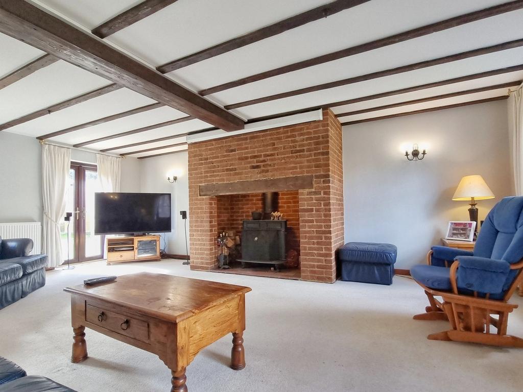 22' 7" x 17' 0" (6.88m x 5.18m) Inglenook feature fireplace with log burner, exposed beams to ceiling, two double glazed French doors opening to the rear garden, two double glazed windows to the front, two radiators.