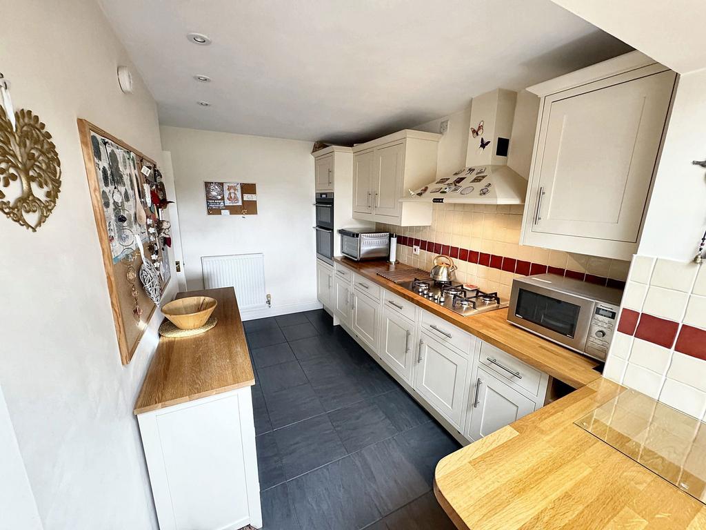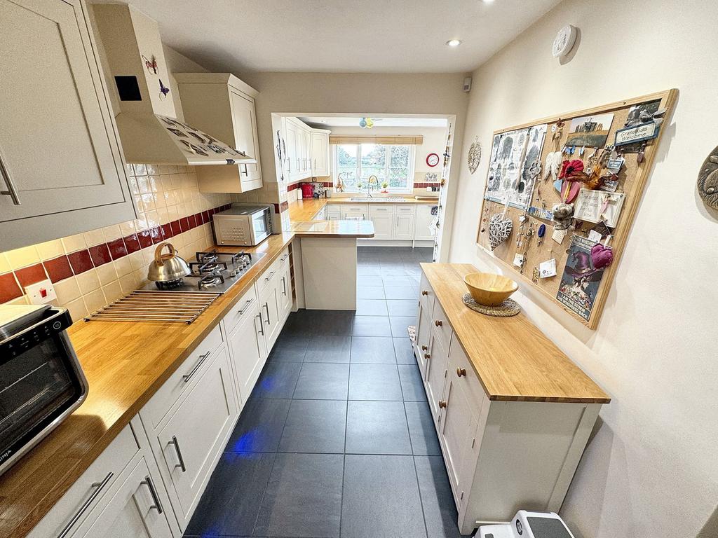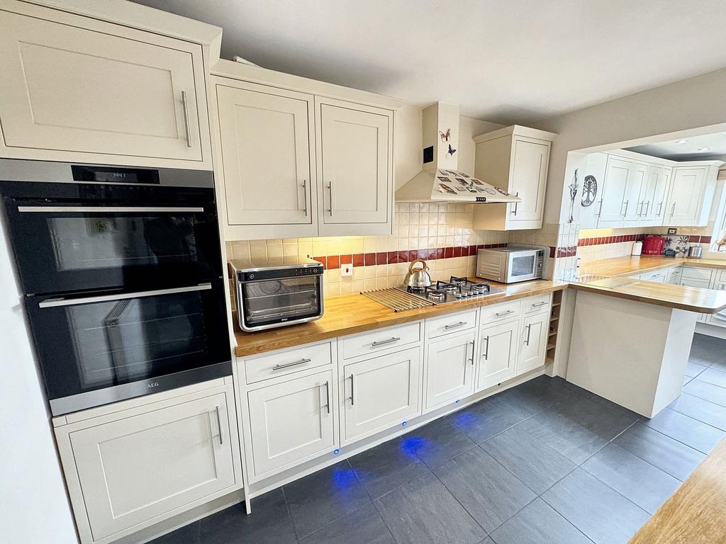 Range of units at base and wall level with wood work surfaces and incorporating a double bowl stainless steel sink with mixer tap. Double glazed window to the rear aspect and double glazed door to the rear garden. Tiled splash areas. Integrated dishwasher. AEG stainless steel 5-burner gas hob with extractor canopy over. AEG double electric ovens. Double glazed skylight window. Spotlights to ceiling. Tiled floor.