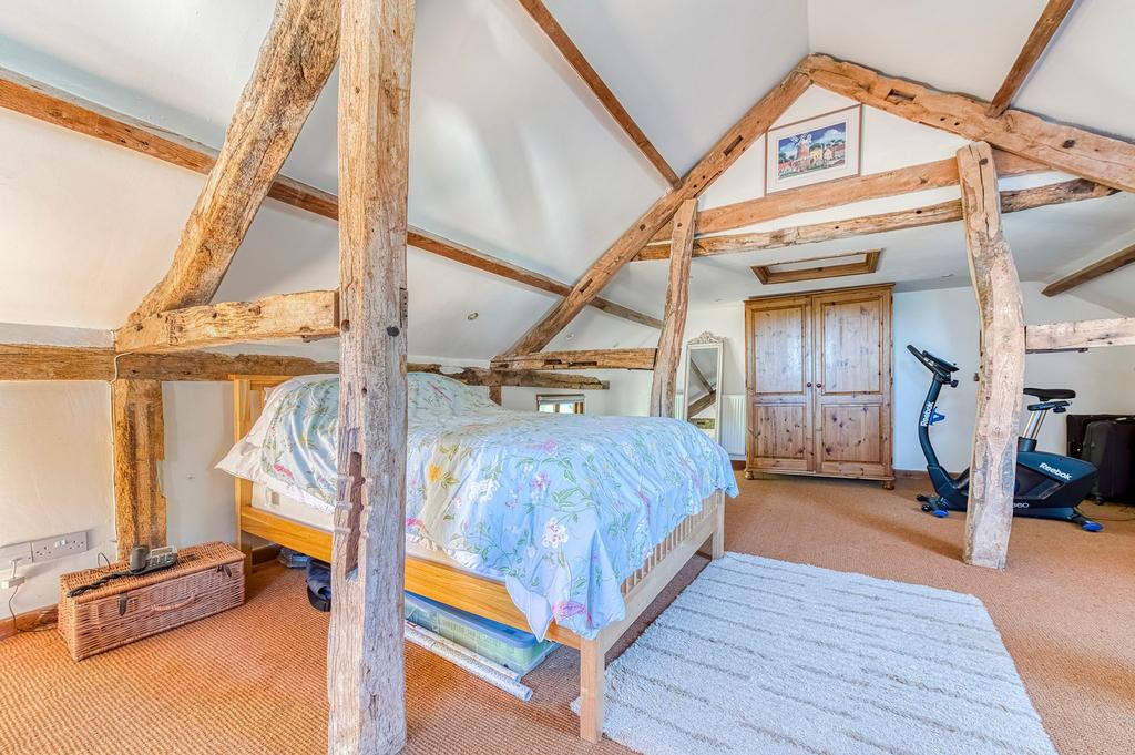 Currently doubling as a home office, this space embodies modern flexibility. A bright ground-floor bedroom with large windows overlooks the garden, complemented by a contemporary en-suite bathroom, refurbished in 2018, with Grohe shower, tiled floor, toilet, and pedestal sink. Upstairs, a vaulted attic bedroom with exposed beams offers a further private retreat with its own en-suite corner bath, basin, and toilet.