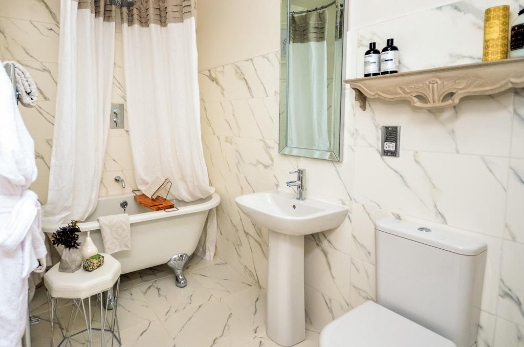 The modern kitchen is appointed with a breakfast bar and features high-quality units, oven and hob, washer/dryer, dishwasher, and a fridge freezer—ideal for those who appreciate both style and practicality. Both bedrooms are generous doubles; the principal bedroom is further enhanced by an en-suite with shower, sink, and WC, as well as the convenience of a walk-in closet. The second bathroom features a luxury suite with a bath and shower over, sink, and WC.