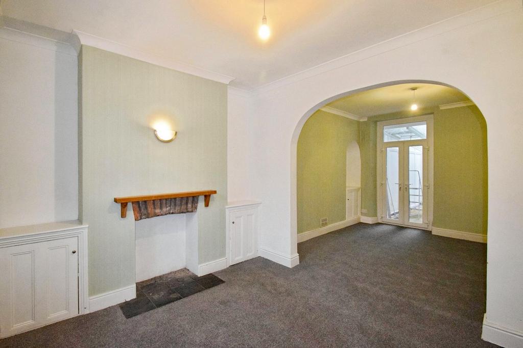 Living/Dining Room - Bright and spacious through reception room with a central archway offering generous space for furniture for both living and dining furniture. The lounge area has a front aspect double glazed window, carpeted flooring which runs throughout both areas, a feature recessed fireplace with a hearth and mantel, two small base cupboards, a radiator and both wall and ceiling lights. The dining area has a set of French uPVC double glazed doors to conservatory, two small base cupboards set into arched recesses, a radiator, understairs storage and a door to the:
