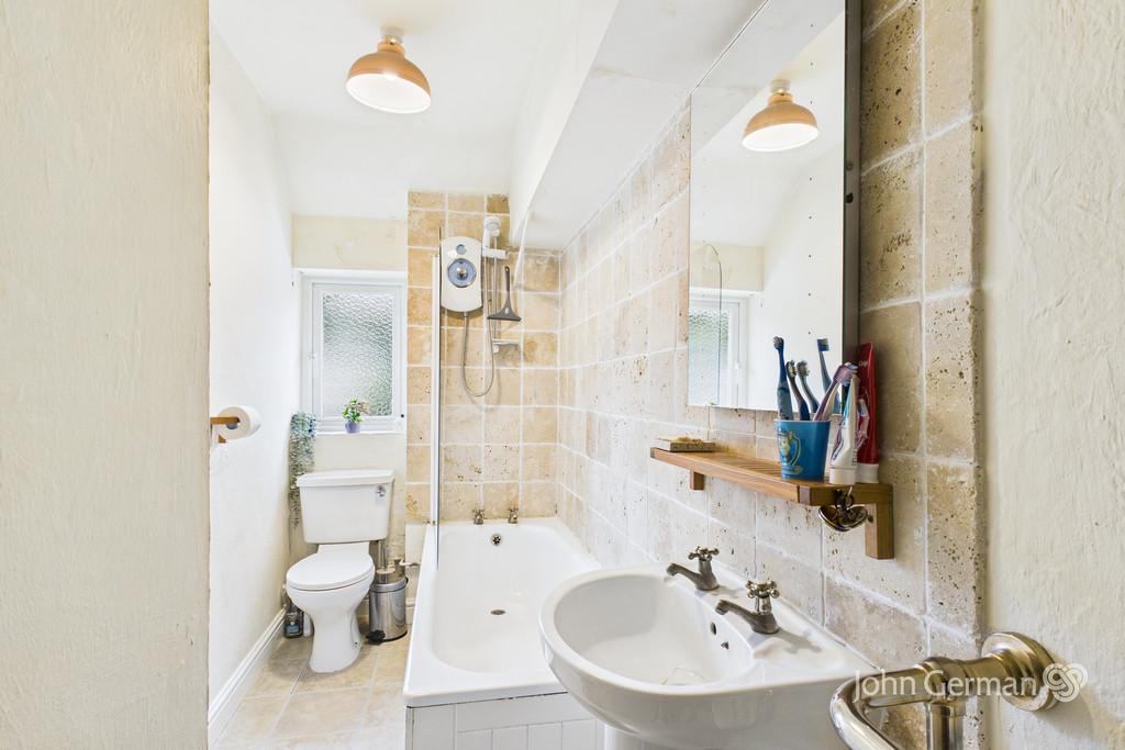The bathroom is finished in white with natural stone tiling to the bath and sink area and includes an electric shower over the bath. An ornamental period-style radiator with towel warmer completes the space.