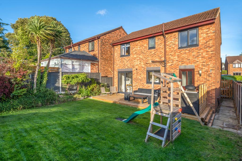 To the rear, there is an enclosed lawned garden that enjoys sun throughout the day. A decked patio area offers an ideal space for outdoor entertaining and Al fresco dining. There is a garden shed and planted borders with a selection of mature trees and shrubs.