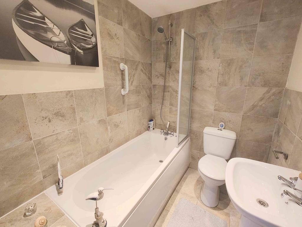 A well-presented and laid out house bathroom that creates a highly functional space. With a panel bath, over bath shower, glass splash guard, pedestal washbasin, close coupled toilet, tiled floor, tiled walls, ceiling inset spotlights, extractor fan and a stainless steel towel radiator.
