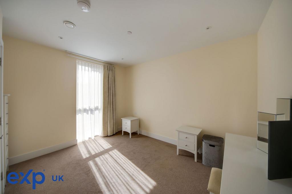 The property boasts a spacious entrance hall leading into a bright and airy 18ft open-plan reception room with kitchen, complete with modern fitted units and integrated appliances. From here, double doors open onto a generous private balcony, perfect for relaxing or entertaining.