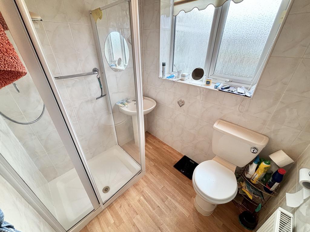 UPVC double glazed window, fitted three-piece suite briefly comprising: shower cubical, wash hand basin, low flush wc and radiator.