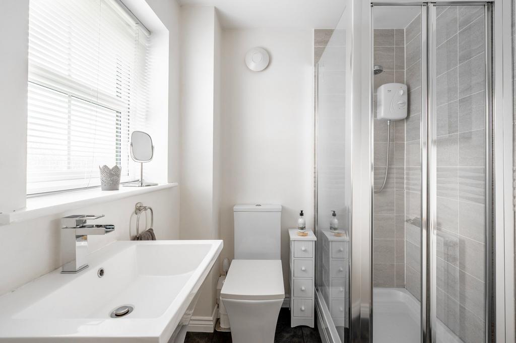 Upstairs, three well-sized bedrooms are arranged off the landing. Two are comfortable doubles, including the principal bedroom, which benefits from its own en suite shower room. The en suite is presented with a modern white suite, including a WC and a rectangular wash basin with a chrome mixer tap. A fully tiled shower enclosure with glass sliding doors houses an electric shower, offering practicality and ease of use. Natural light streams in through a window fitted with blinds, brightening the room and complementing the clean, neutral finish.