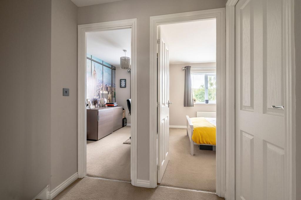 The remaining bedrooms, all carpeted, enjoy a neutral décor and plenty of light, with the smaller room offering versatility as a home office or nursery. The family bathroom completes the upper floor, fitted with a WC, modern wash basin with chrome mixer tap, and a panelled bath with overhead fittings. Textured wall tiles provide both practicality and a stylish focal point.