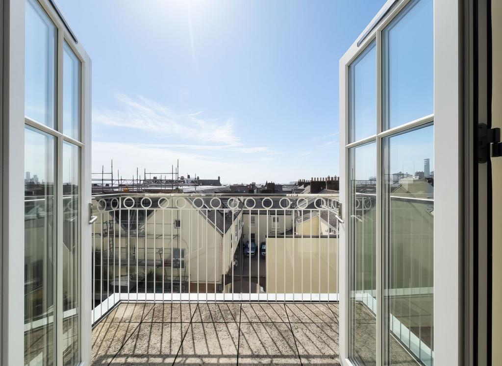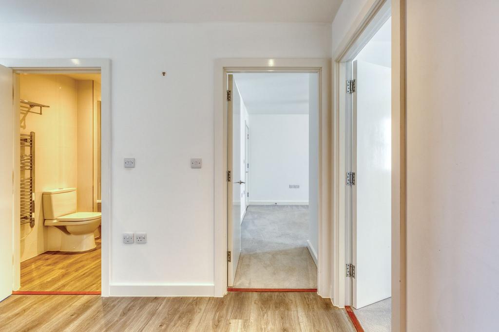 The principal bedroom features an en-suite bathroom and fitted bedroom units, while the second double bedroom is served by a contemporary family bathroom. Both bedrooms are generously proportioned, offering comfort and flexibility for professionals, couples, or small families.