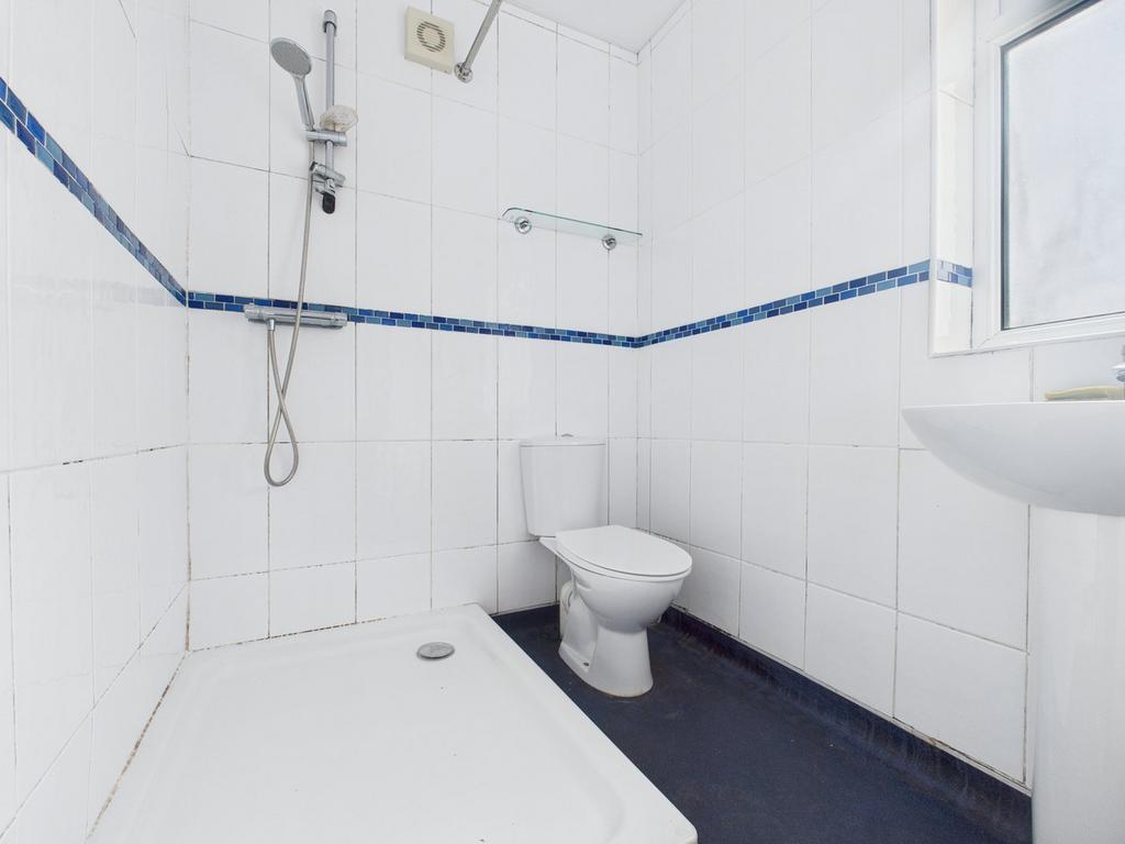 Fitted with a two piece suite comprising a low flush WC and hand wash basin with mixer tap. Wall mounted mains fed shower with built in tray and chrome curtain rail. Fully tiled walls with extractor fan. Obscure uPVC window to front elevation.