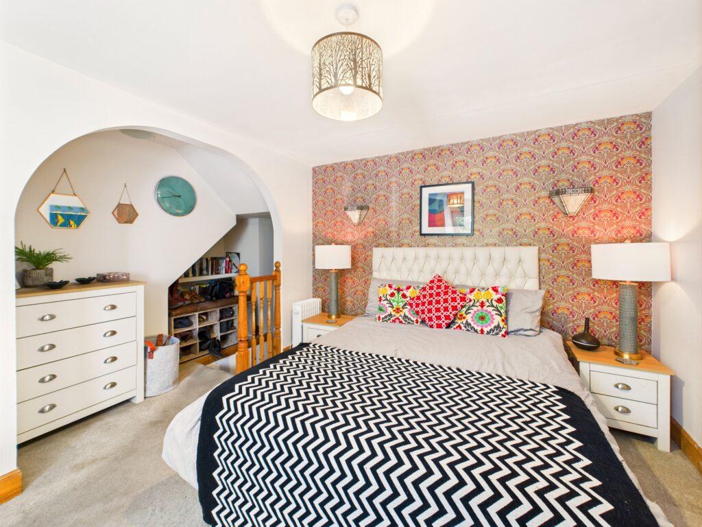 Good sized double bedroom with bay window views to the front. Carpeted flooring, alcove shelving, pendant lighting, feature wallpaper to one wall, central heating radiator and socket points. Ample space for bedroom furniture.