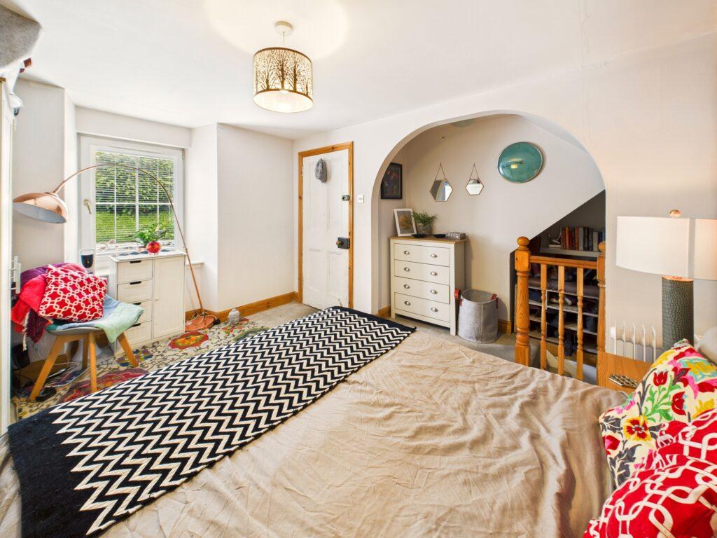 Large double bedroom on ground floor with dressing area and ensuite bathroom. Window view to the front, carpeted flooring, space for freestanding furniture, pendant lighting, floral wallpaper to one wall, central heating radiator and socket points. Feature arch leading to dressing area with inbuilt shelving and ensuite bathroom.