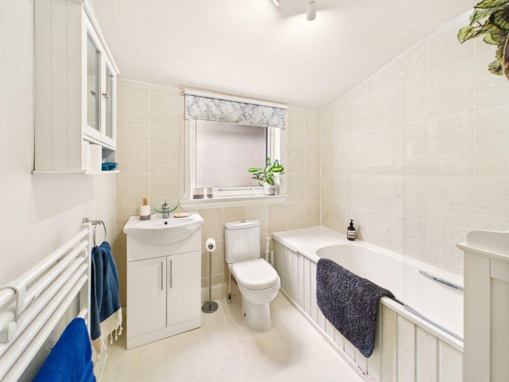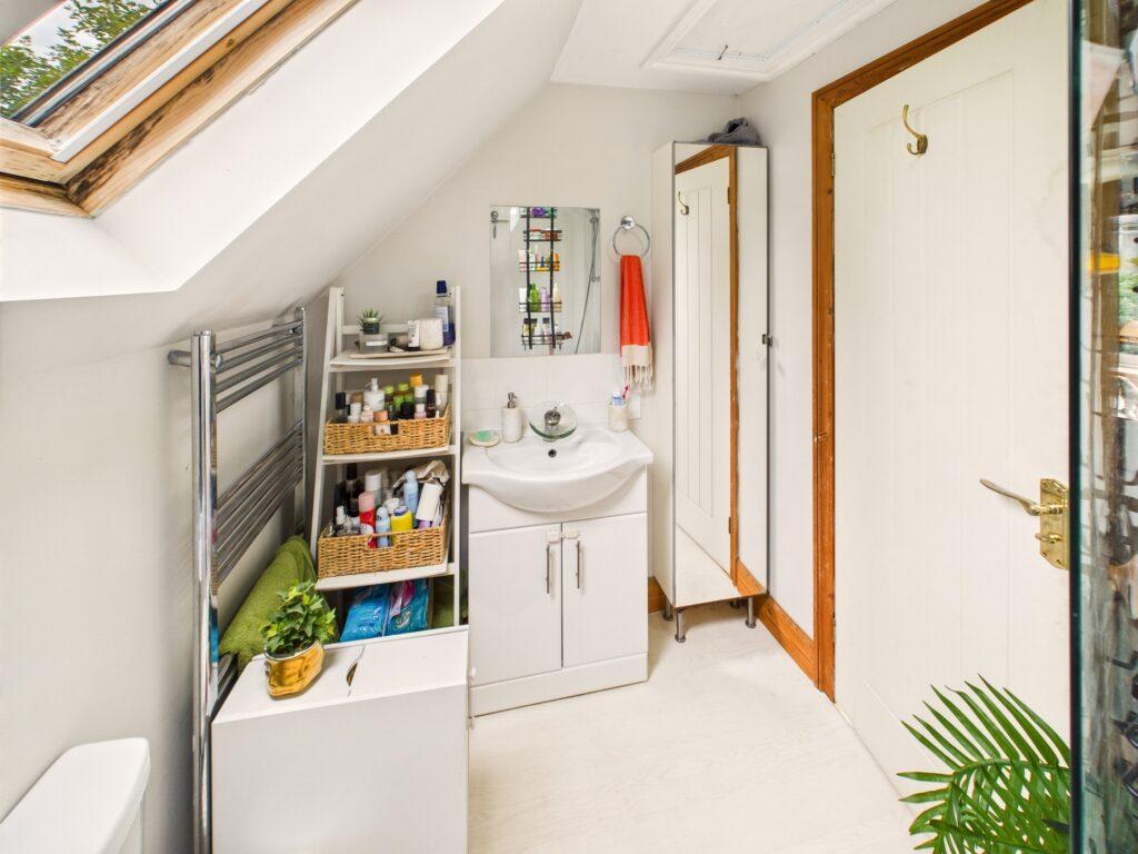 Three piece suite including p-shaped bath, shower screen and attachment. Countersunk WHB with storage below and WC. Velux to the rear, vinyl flooring, spotlighting, heated towel rail and extractor fan. Loft hatch access.
