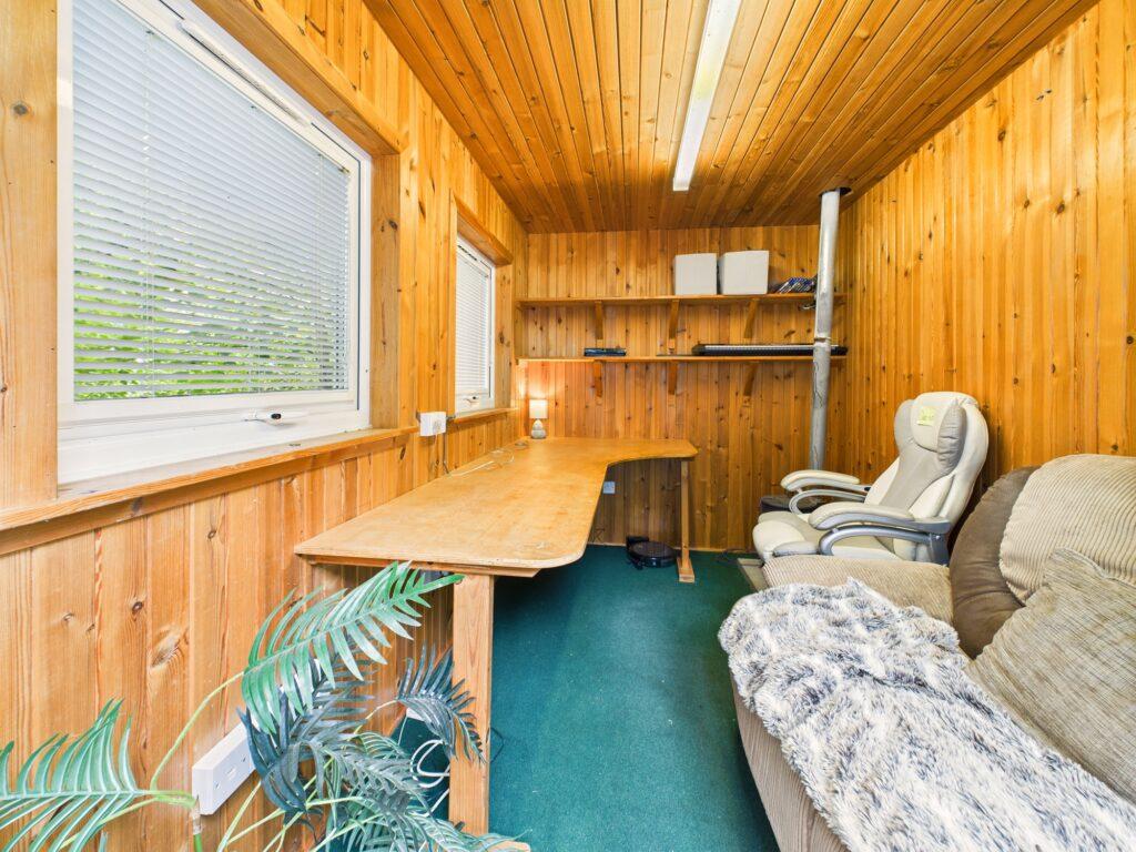 Superb addition to the multiple outdoor spaces this detached studio is fully equipped with desk space, shelving and room for furniture. Timber cladding, strip lighting and ample socket points. Dual windows with inbuilt blinds to the rear gardens and double UVPC glazed doors. Wood burning stove in corner providing year-round heat.
