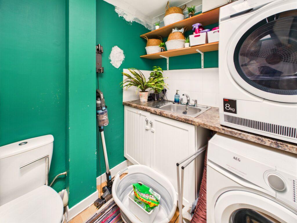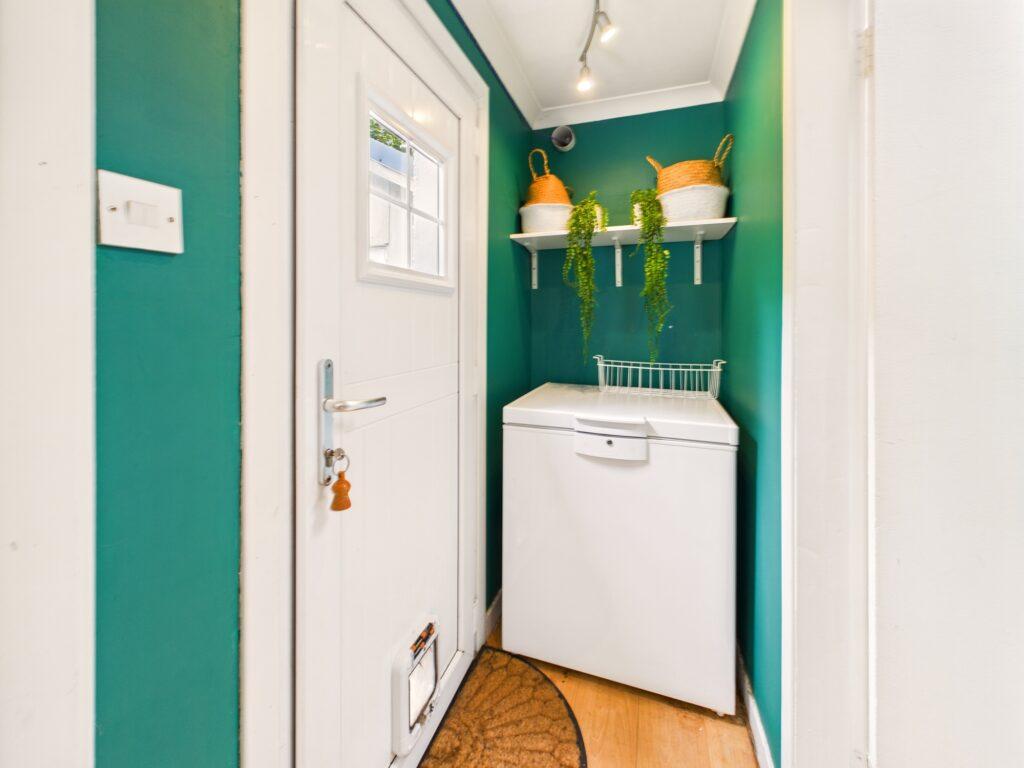 Entry from rear gardens to laminate floored porch with feature spotlighting and socket point. Worktop with base cabinets and stainless steel sink, WC and wall shelving. Space and plumbing for white goods.