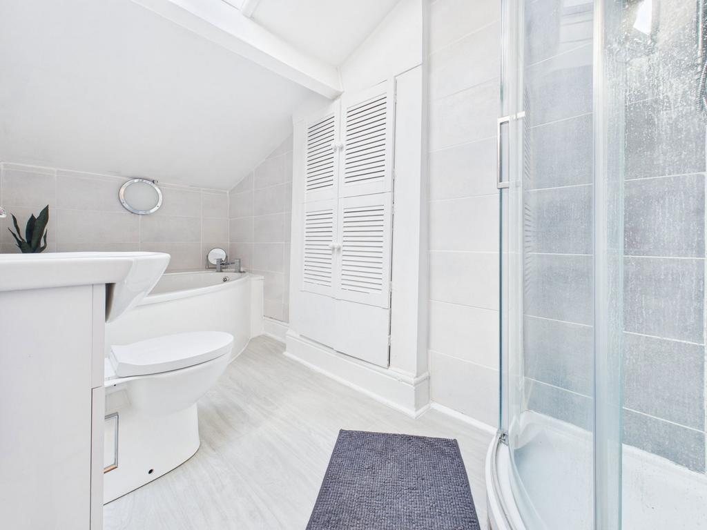 Completing the first floor, the bathroom is well-presented and fitted with a four-piece suite comprising a corner bath, separate shower enclosure, WC, and wash basin with storage beneath. Finished in neutral tiling with a light, modern feel, the space is practical yet stylish. The room’s layout makes excellent use of the available space, while built-in cupboards provide useful additional storage. This is a bright and functional bathroom, designed to serve the needs of a busy household.