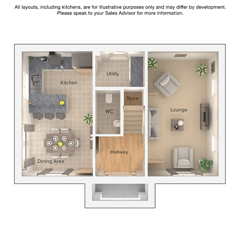 Artists' impressions are drawn from an imaginary viewpoint and are intended to give an impression of the house design. Photographs may be from Seddon Homes developments across the North West. Neither the artists' impressions nor the photographs are intended to give an accurate description of any specific property offered for sale, its setting or its surroundings. These do not show final details of gradients of land, boundary treatments, local authority street lighting or landscaping. We aim to build according to the layout, but occasionally we do have to change house designs, boundaries, landscaping and the positions of roads, footpaths, street lighting and other features as the development proceeds. Floor plans: The dimensions shown are approximate. Each home is built individually and so the precise measurements may vary from that shown, although every endeavour is made to make the dimensions as accurate as possible. We give maximum dimensions that may include fitted wardrobes, sloping ceilings, bay windows, and any other features. All layouts, including kitchens, are for illustrative purposes only and may differ by development. Please speak to your Sales Advisor for more information.