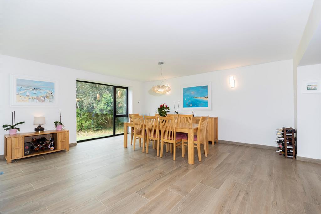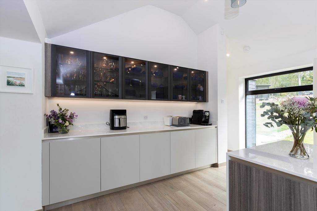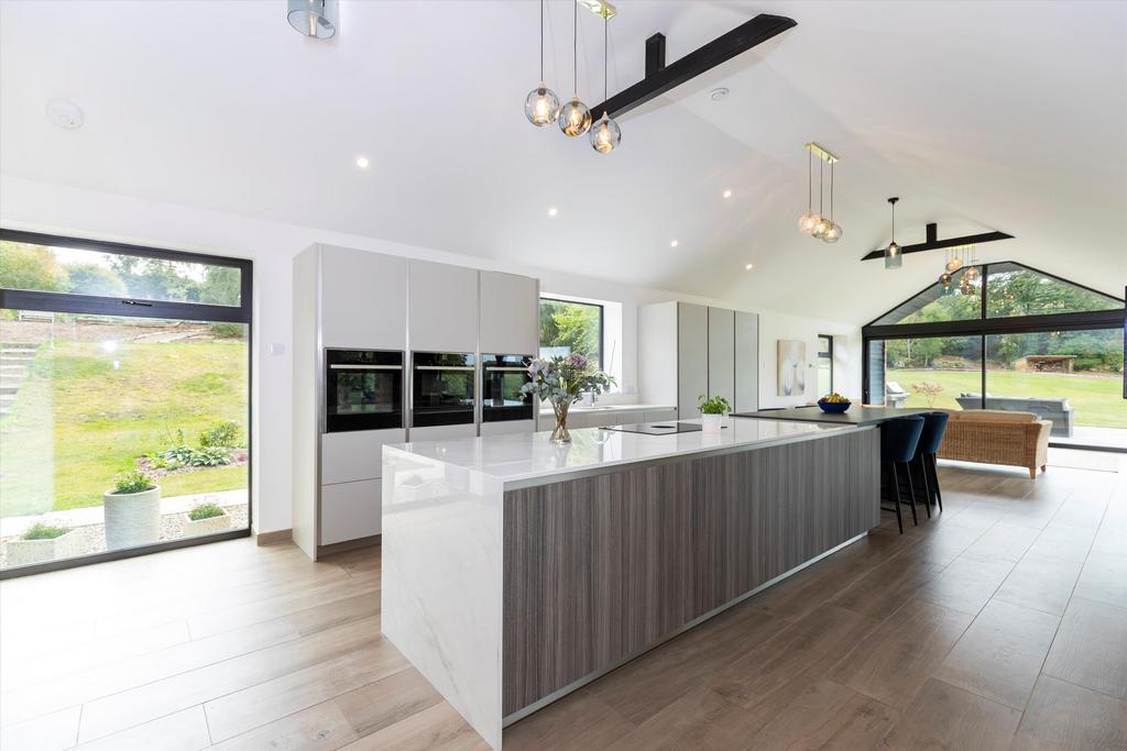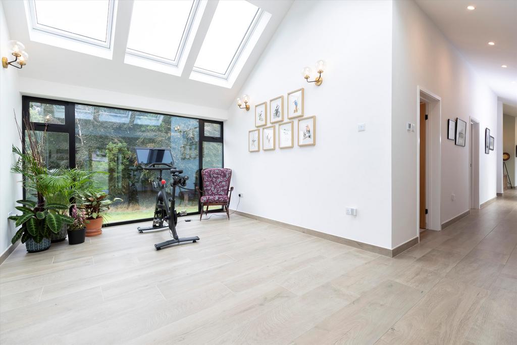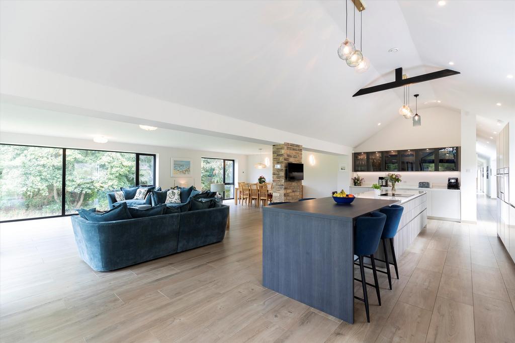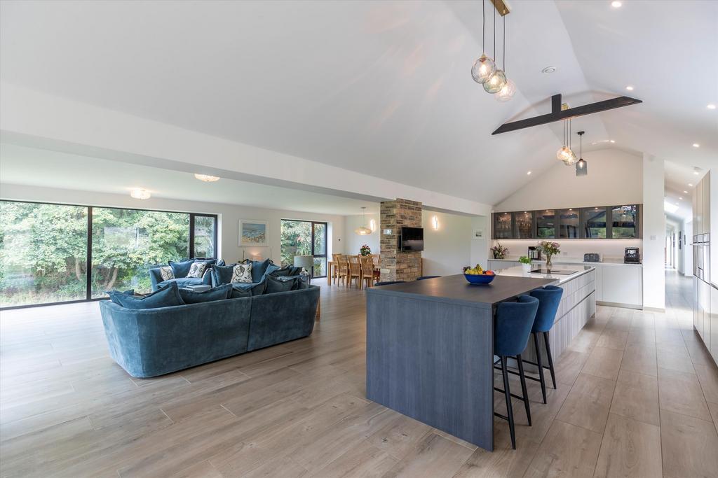 The open-plan kitchen/living/dining room is the true heart of the home—spacious, stylish, and designed for modern family life. Every window frames a view of the surrounding grounds, ensuring a strong connection with nature. The bespoke kitchen features sleek contemporary cabinetry around a central island, and includes a full suite of premium appliances: two single ovens, one being a steam oven, as well as an additional microwave oven, warming drawer, induction hob with integrated extractor, Quooker tap, fridge, freezer, and dishwasher.