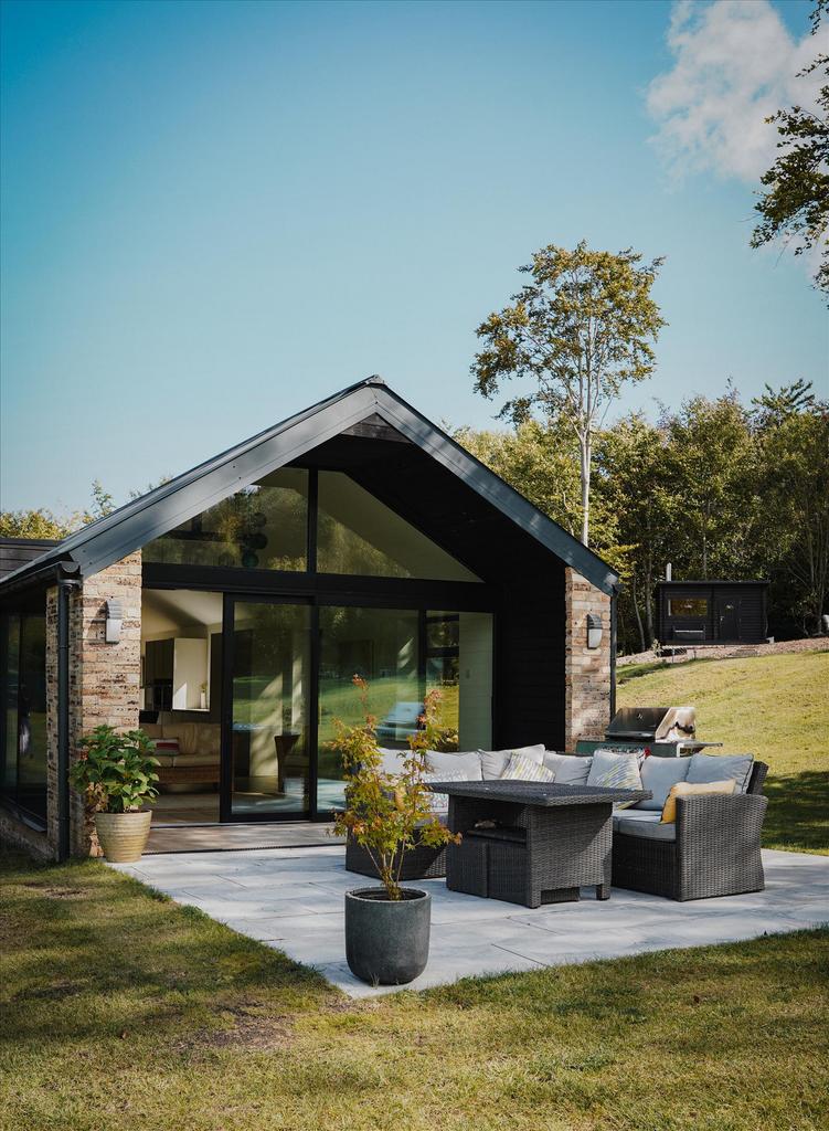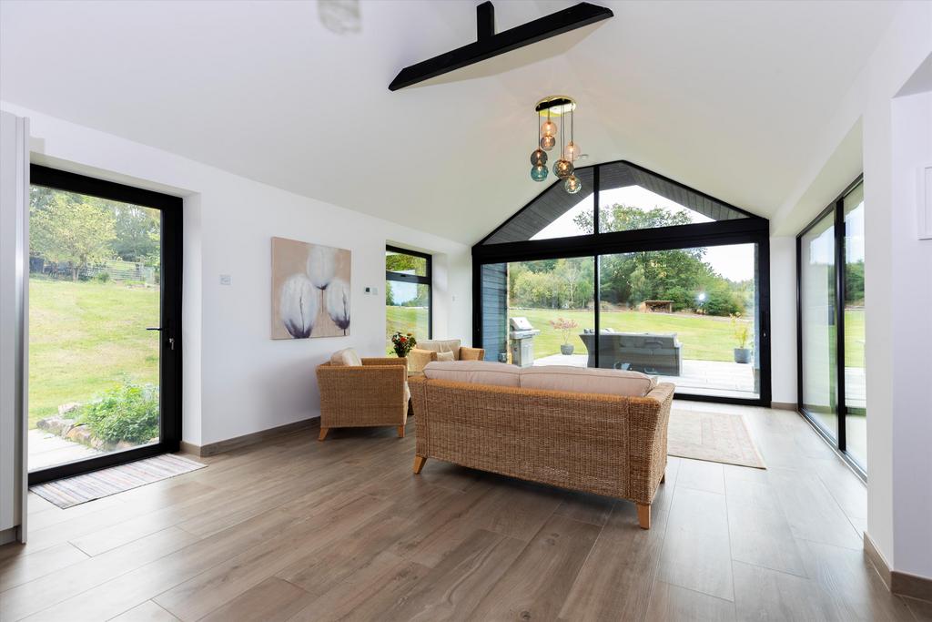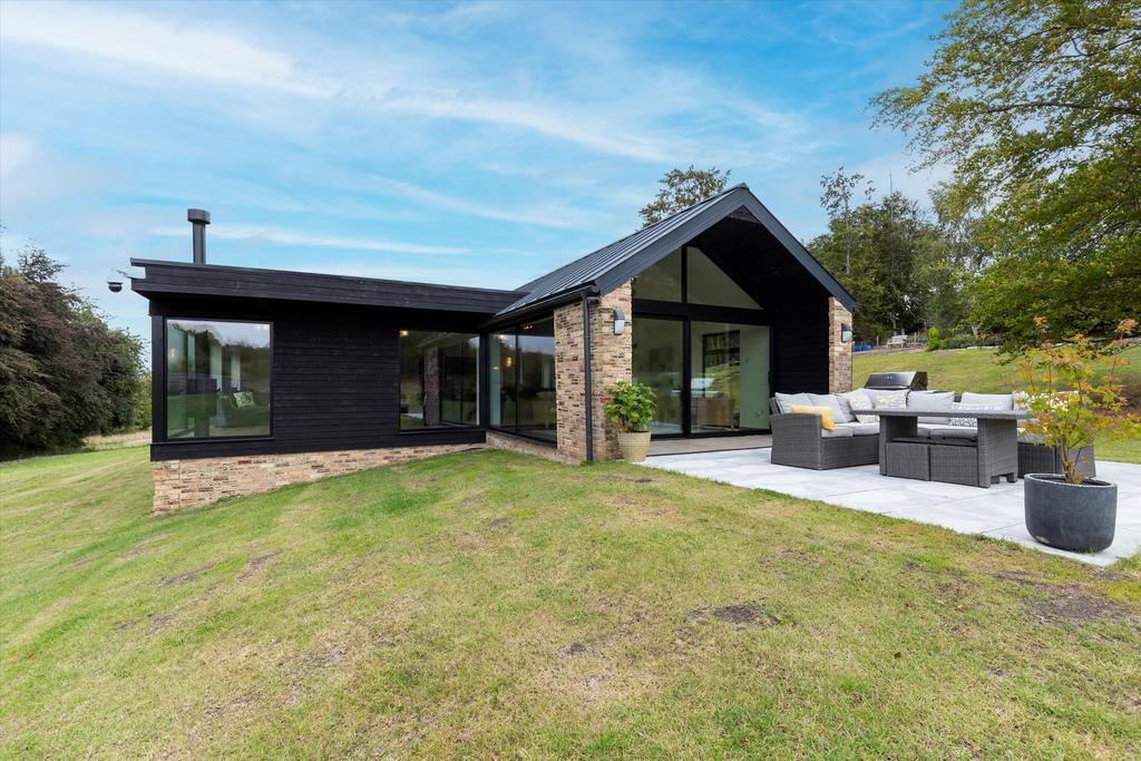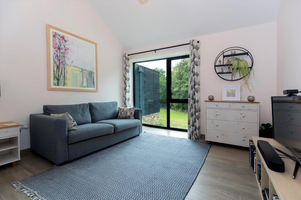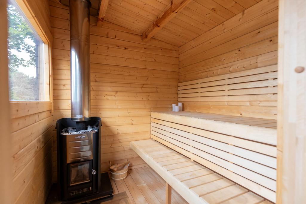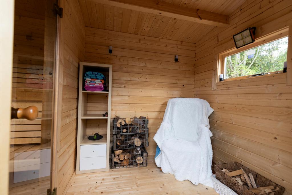 A fully fenced woodland area offers both privacy and biodiversity, while a log-fired sauna sits in a quiet corner, perfectly positioned to take in breathtaking sunsets.
