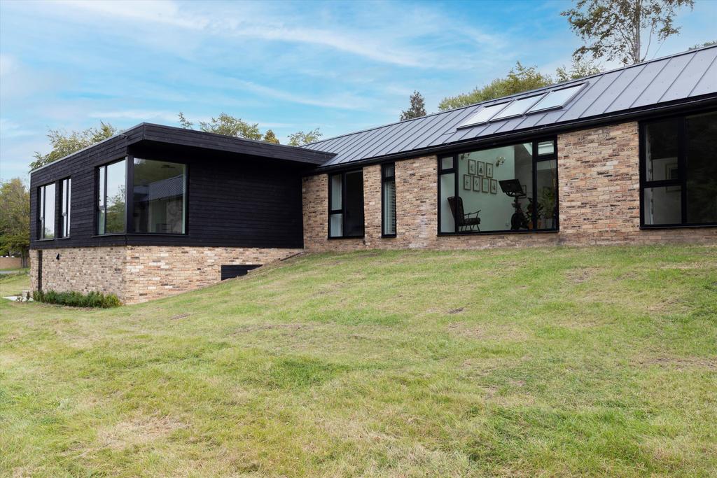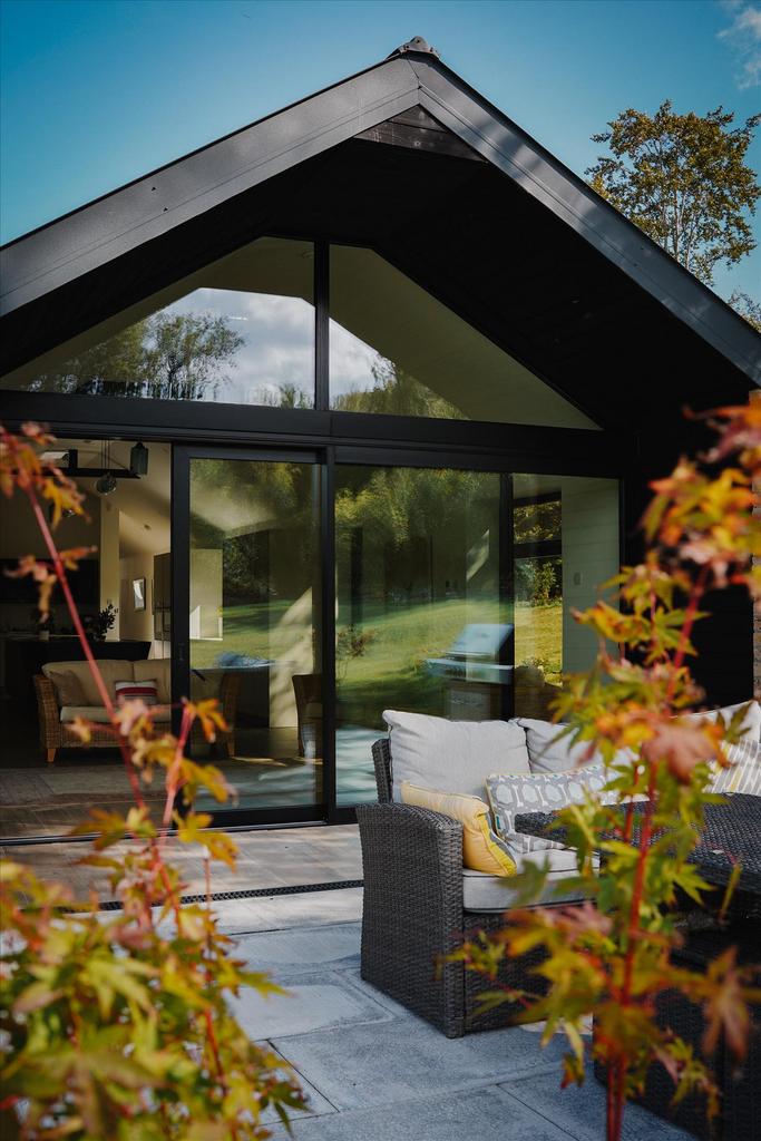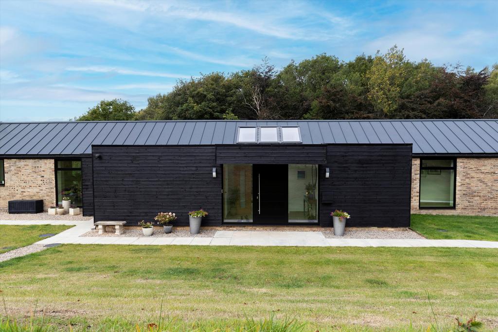 The home's torched larch cladding and full-height aluminium windows create a bold visual statement, while the interiors are designed to capture natural light and showcase the surrounding landscape. Upon entering, the impressive reception hall/lobby—with vaulted ceilings and expansive glazing—immediately sets the tone, best suited as a reading room, library, or formal entrance space.