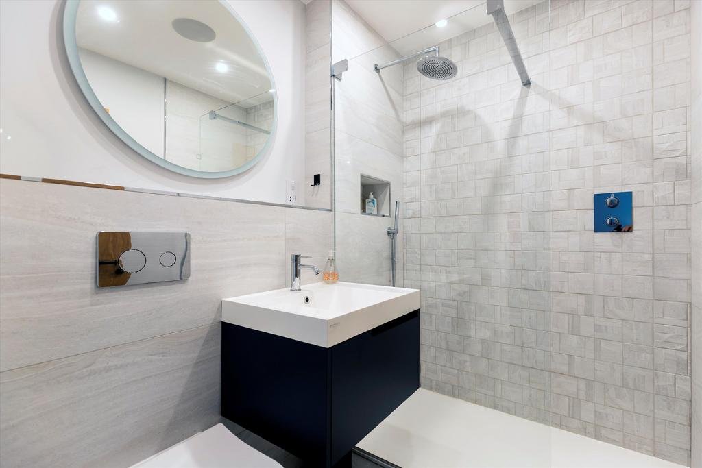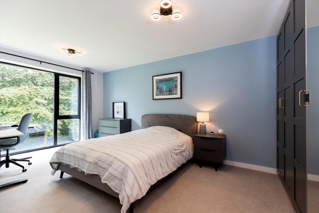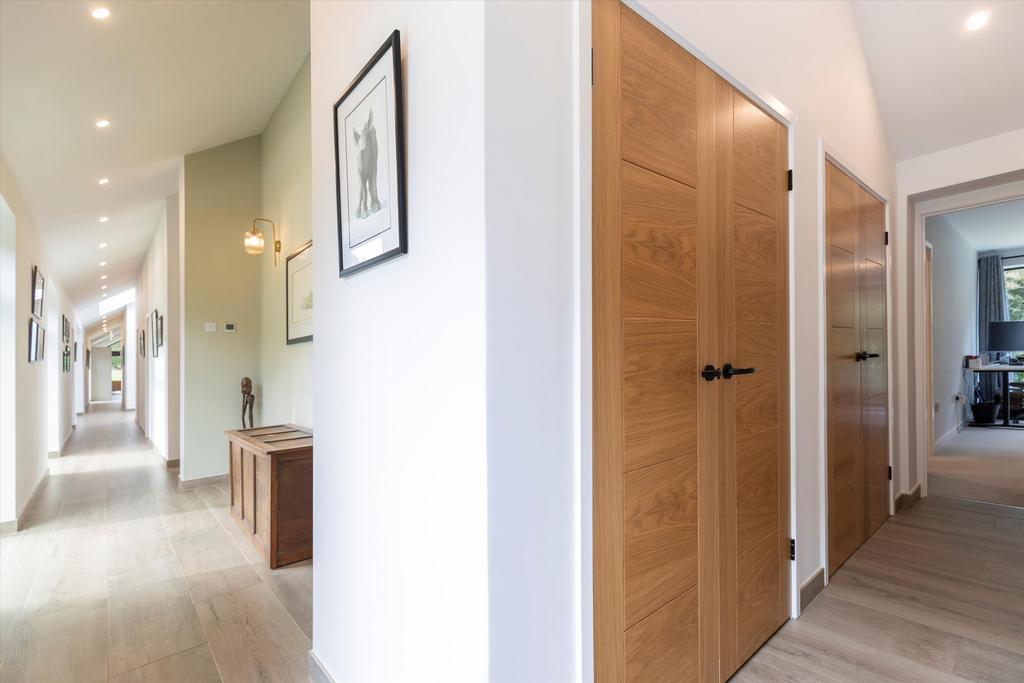 A light-filled corridor connects to the principal bedroom suite, complete with a walk-in dressing room, full-height corner glazing, and a luxurious en suite with freestanding bath, large walk-in shower, and vanity basin. Two additional bedrooms benefit from well-appointed en suite bathrooms, while the remaining two bedrooms—one currently used as a snug, the other as a guest bedroom—share access to a stylish family bathroom, the final room accommodates the home office.
