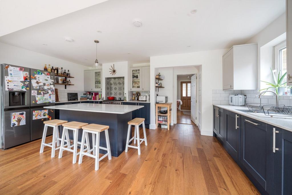 Located in a highly convenient position just over half a mile from Weybridge Station on foot, which offers excellent links to London, this beautifully refurbished and extended four-bedroom, two bathroom semi detached home is presented in superb condition throughout. The property benefits from a generous rear garden, ample off street parking, and a detached garden room, making it ideal for modern family living. On the ground floor, a large front reception room leads to a stunning open plan kitchen/dining space spanning the rear of the property. This impressive area features three roof windows and bi folding doors opening onto the garden, flooding the space with natural light. The first floor offers three well proportioned bedrooms (bedrooms two, three and four), along with a modern family bathroom and a separate WC. A further staircase rises to the second floor, where you’ll find the principal bedroom complete with a Juliet balcony overlooking the garden and a luxuriously fitted ensuite shower room with WC. This is a spacious, thoughtfully laid out home in a popular and convenient location, ideal for families and commuters alike.
