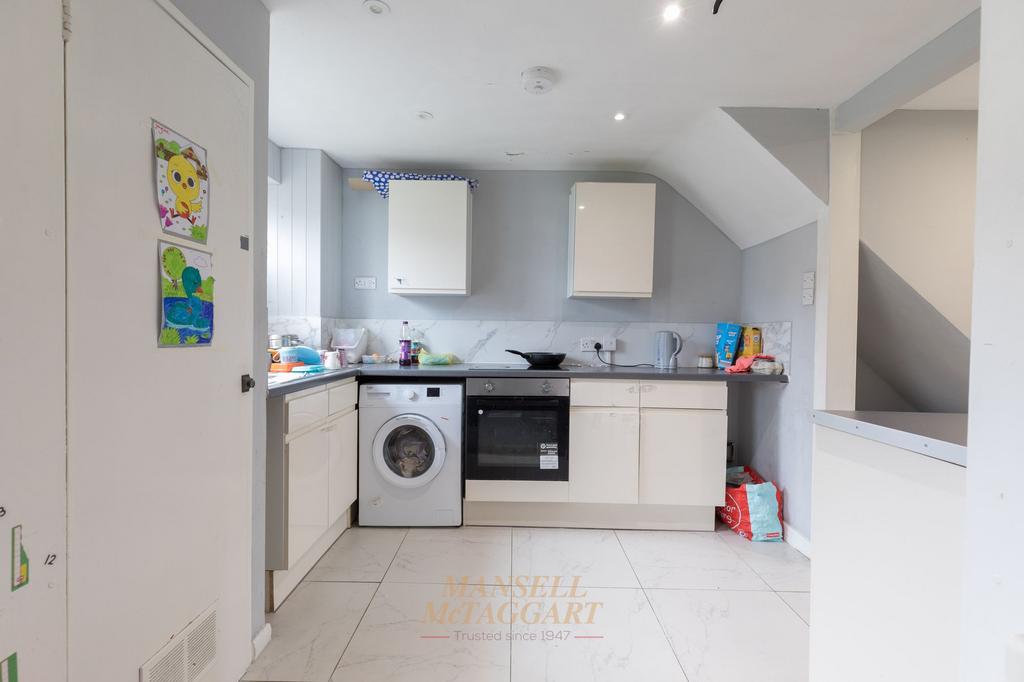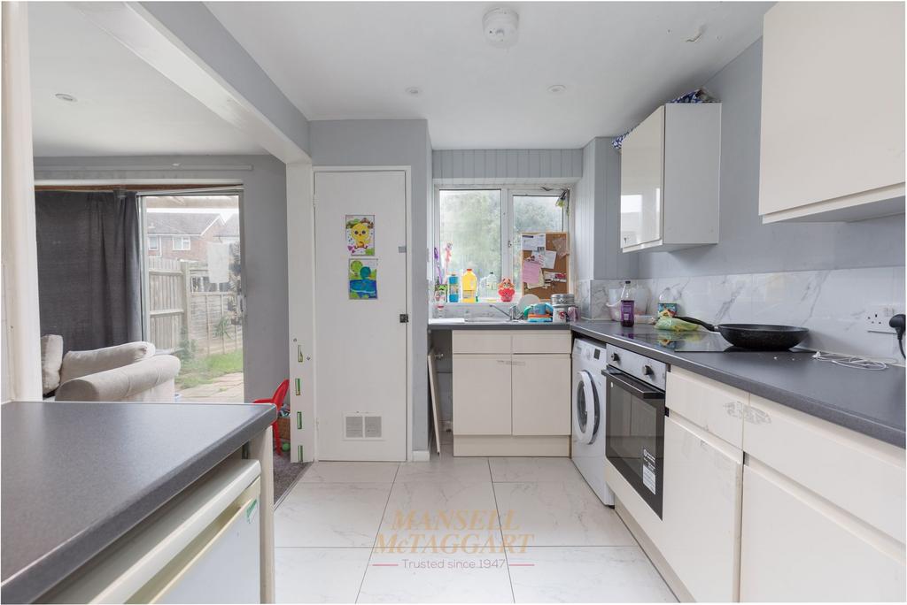 The kitchen diner completes the ground floor layout, featuring a range of cupboards and providing access to the rear garden.