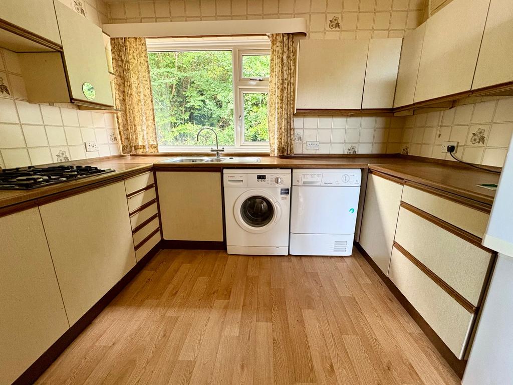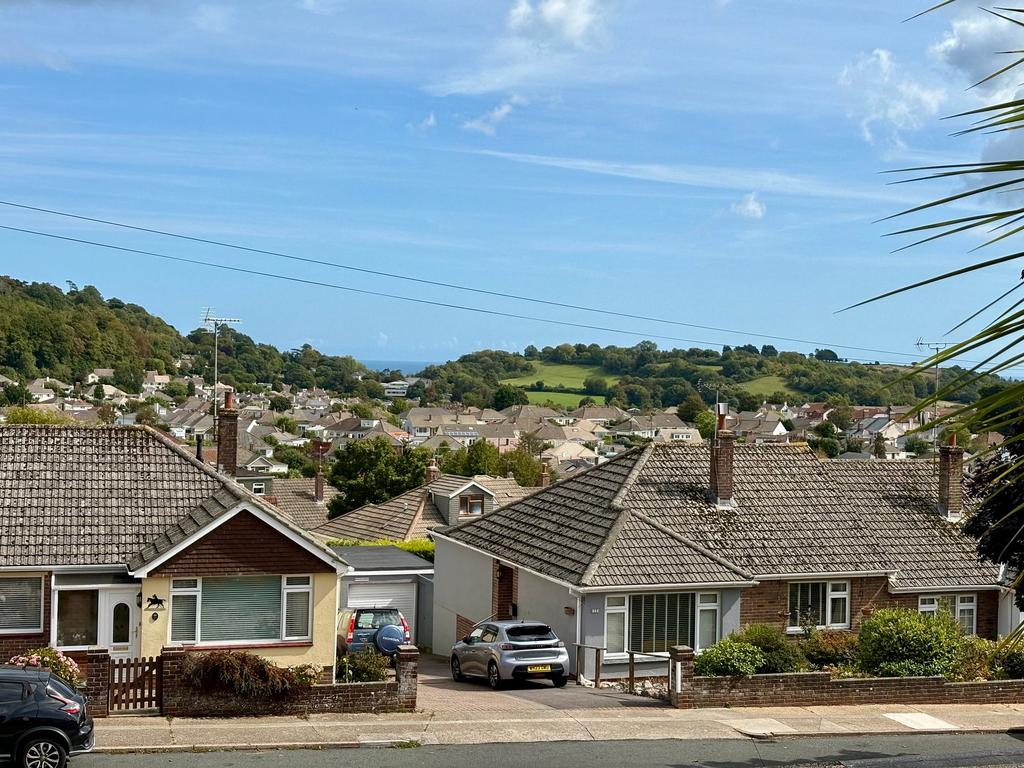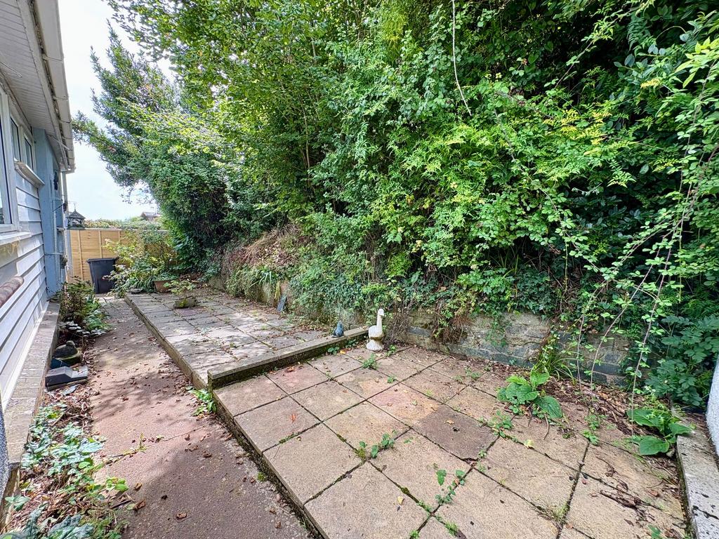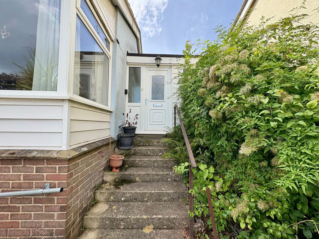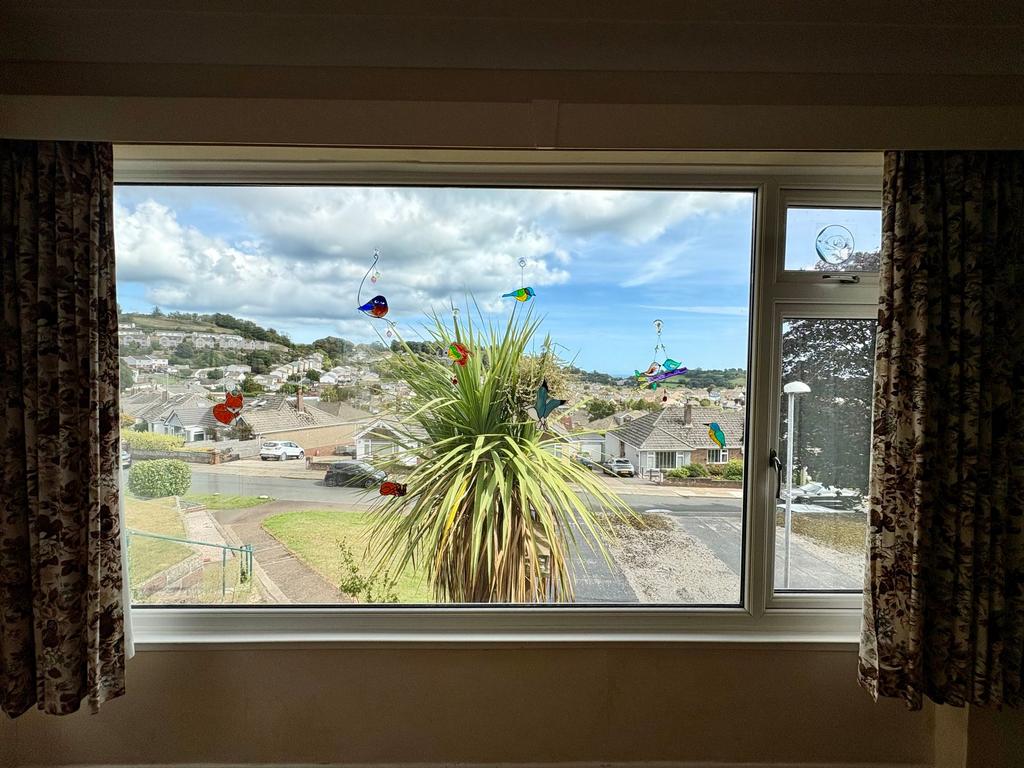 A sloped pathway and steps rise to the front door opening to the ENTRANCE HALL with large storage room with shelving and housing the electric meters. The SITTING ROOM has a double aspect with picture window enjoying open views over the surrounding area towards the sea at Lyme Bay in the distance. The KITCHEN is fitted with a range of units and wood effect work tops with inset sink unit. Built-in double oven, four ring gas hob, provisions for washing machine and dryer. Wood effect flooring and window to the rear.
