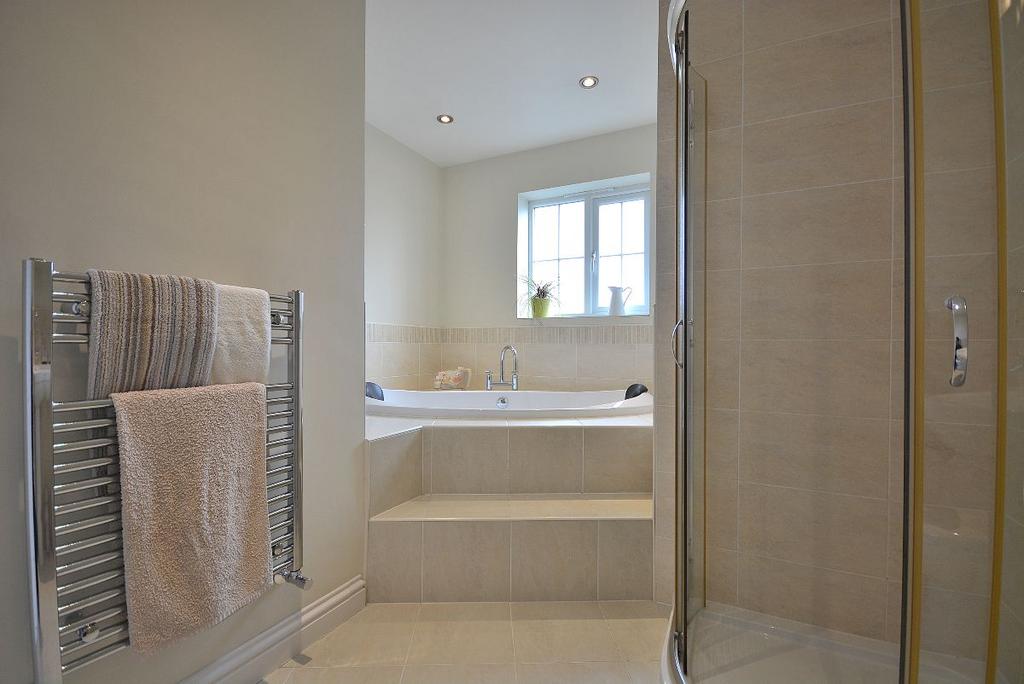A beautifully finished and neutrally tiled family bathroom with four piece suite including a free standing bath which is currently inset into a raised tiled entrance, shower enclosure with internally plumbed shower with thermostatic valve, underfloor heating, heated towel radiator, ceiling lighting, LED mirrored cabinet with toothbrush charging point and an obscure double glazed window to the front elevation.