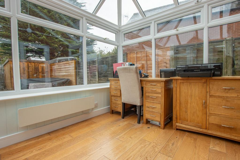 The property is set back from the road behind a mature boundary hedge, with a shingle driveway leading to a parking area in front of the house which can comfortably accommodate three vehicles. Gated access at the side of the house leads to a wide passage which extends to the rear garden, where there is a central section of lawn leading on to a delightful paved seating/barbecue area.
