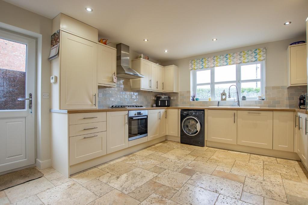 Visitors are welcomed into the spacious entrance hall, with stairs rising to the first floor and doors into the ground floor cloakroom and a large understairs storage cupboard. The kitchen/breakfast room comprises an extensive collection of shaker style base and wall-mounted storage units under fitted work surfaces, incorporating an integrated oven, hob and dishwasher. The room also provides plenty of space for a breakfast table with chairs, along with an entrance door opening in from the side passage. Double doors from the kitchen open into the impressive sitting room, which measures over 20ft in length and provides generous space for a dining table alongside lounge furniture. Beyond the sitting room is the conservatory, offering useful additional reception space with doors out to the garden.