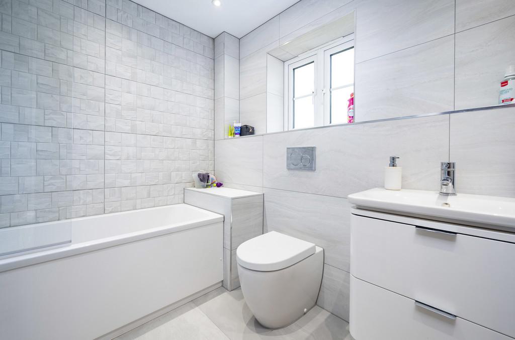 FAMILY BATHROOM: With tiled flooring and walls and containing a bath with mixer tap and shower over, WC, vanity suite and chrome heated towel radiator.